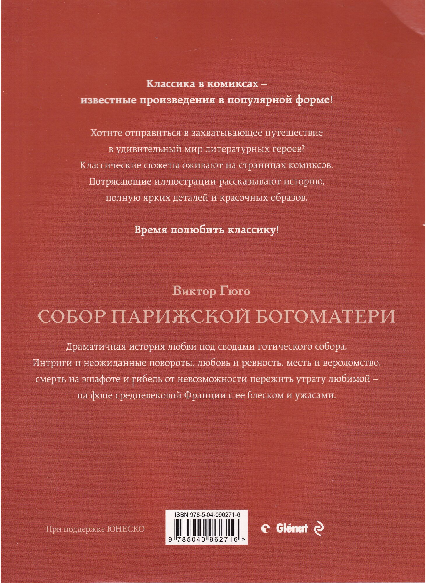 Картинки абсолютно не соответствуют содержанию книги. Эсмеральда представлена, как продажная женщина на закате карьеры. Наряды и позы на каждой картинке просто поражают своей пошлостью. Сплошное насилие, в том числе над глазами читателей. Когда читаешь книгу, подобное, даже близко, в голову не приходит. Непонятно, вообще, для какой аудитории этот комикс. Покупала, чтобы познакомить ребенка с замечательным произведением, не загружая тяжёлым повествованием Гюго. Я понимаю, что указано возрастное ограничение 16+, но в этом прочтении полностью теряется вся суть и трагизм произведения. Посоветую только тому, кто хочет своими глазами увидеть, как без значимого искажения диалогов можно испортить шедевр мировой литературы.