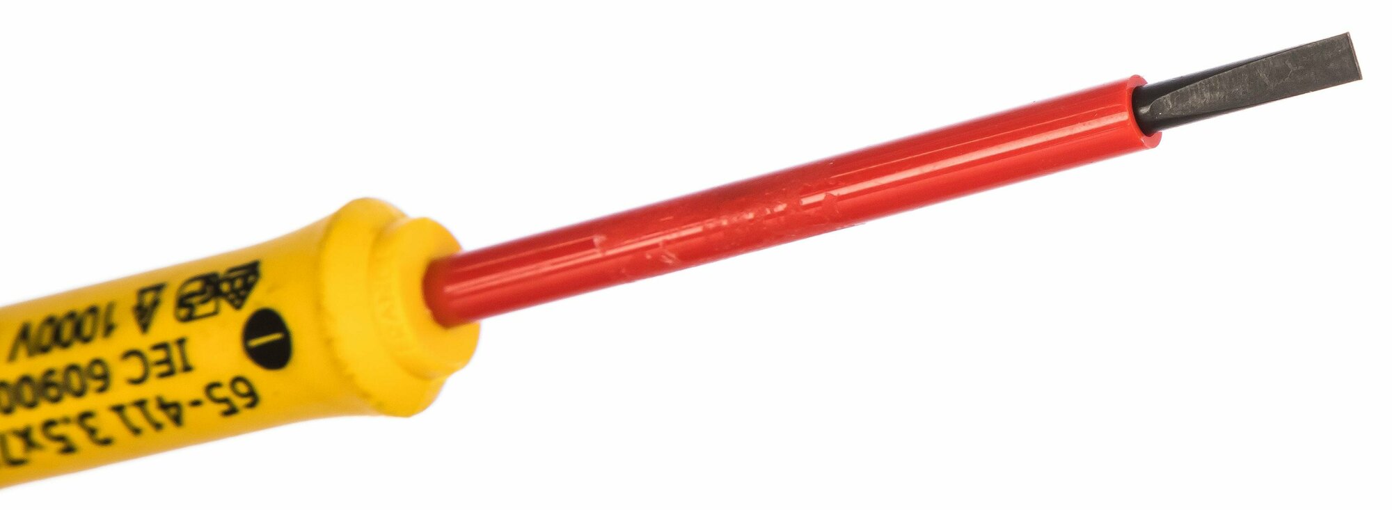 Отвертка электрика "FatMax VDE 1000V" изолированная с расширяющимся жалом под прямой шлиц. Стержень отвертки покрыт очень прочным полиамидным изоляционным материалом, защищающим от ударов, абразивных воздействий и влаги. Отвечает промышленному классу безопасности EN60900:2004 при работе с открытыми токоведущими элементами под напряжением до 1000 В. Большая удобная рукоятка обеспечивает большой момент и максимальный комфорт при работе. Сужение рукоятки обеспечивает более высокий уровень контроля отвертки, когда требуется повышенная точность прикладываемого момента.