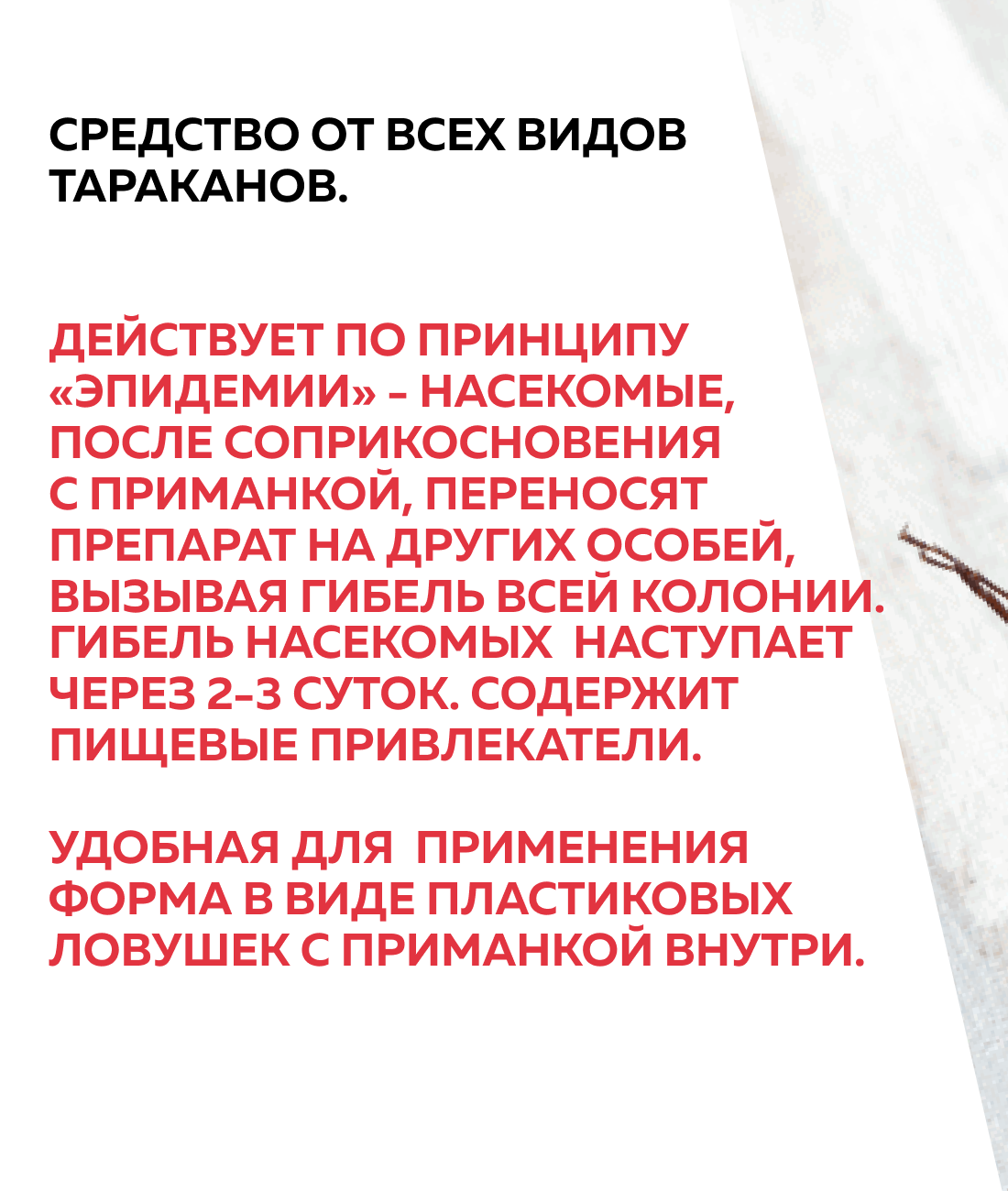 Действует по принципу «эпидемии» - насекомые, после соприкосновения с приманкой, переносят препарат на других особей, вызывая гибель всей колонии. Гибель насекомых наступает через 2-3 суток. Содержит пищевые привлекатели. Удобная для применения форма в виде пластиковых ловушек с приманкой внутри.