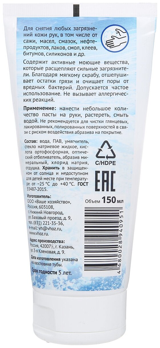 Средства индивидуальной защиты и инвентарь Ваше Хозяйство Крем Альба ЧИСТОНИК чистящая паста для рук 150 мл