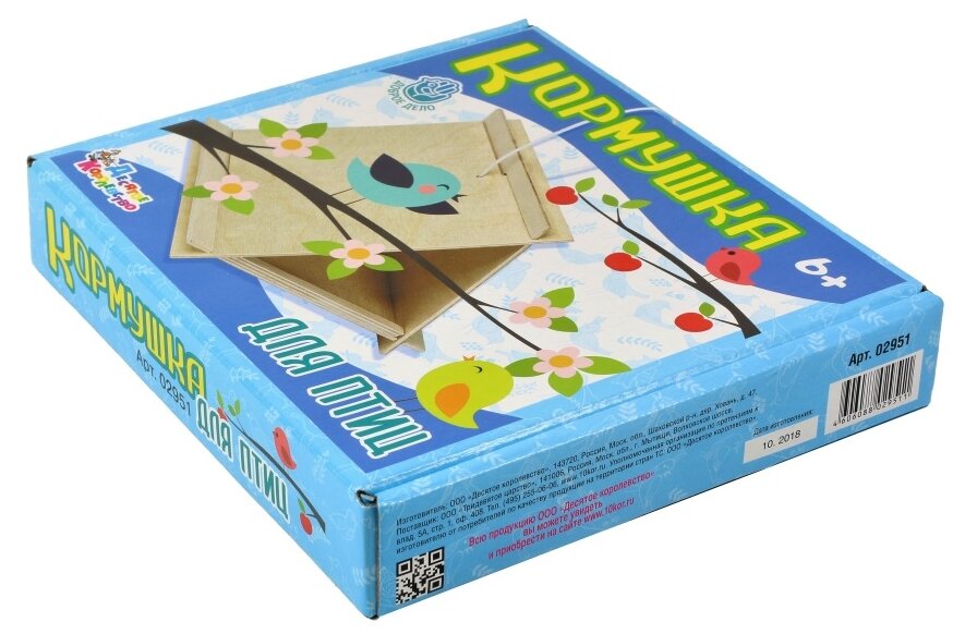 «Кормушка для птиц» – игрушка из дерева и текстильного шнура. Она является самой простой из всей линейки кормушек «Десятого королевства». Состоит всего из 4-х деталей, при сборке не потребуется никакого инструмента для подгонки и заворачивания винтов и шурупов. Предназначена для небольших птиц – воробьи, синицы, снегири и т.п.