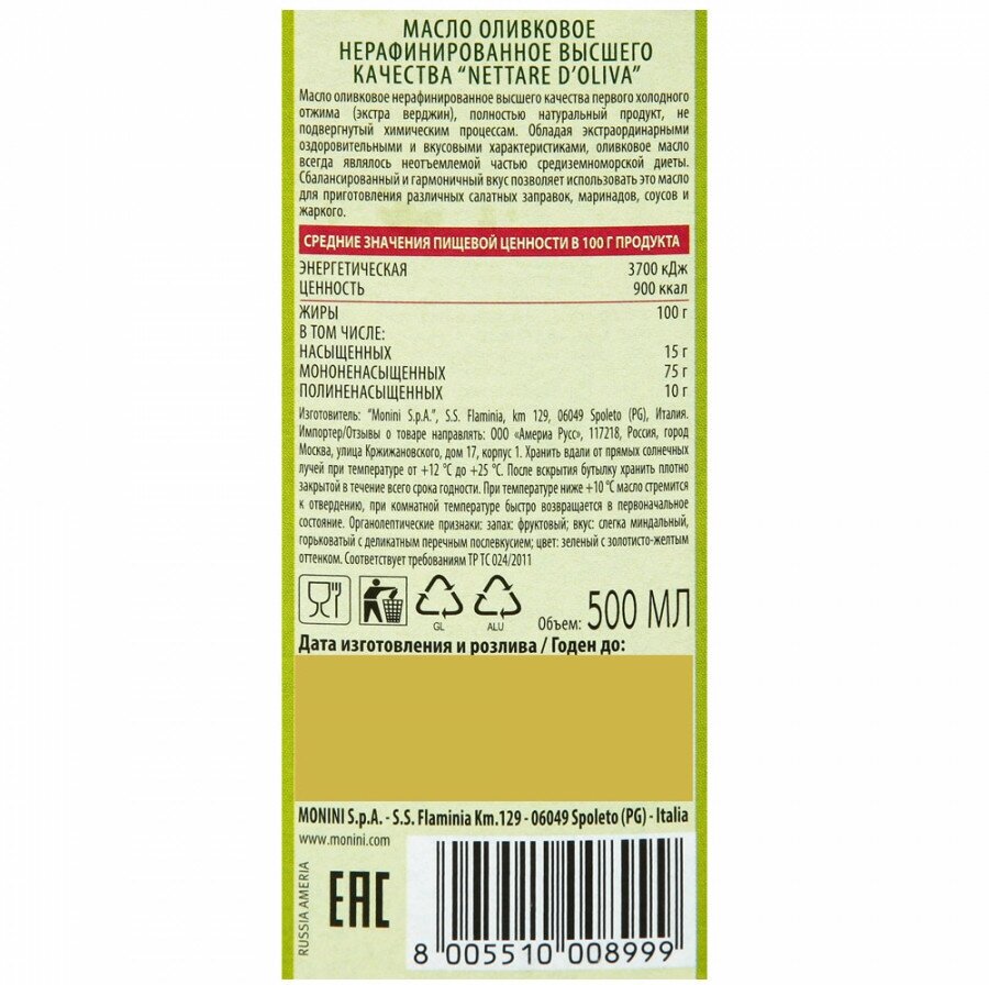 Масло Оливковое Monini Nettare d Oliva Extra Virgin нерафинированное холодного отжима высшего сорта Экстра Вирджин 05 л