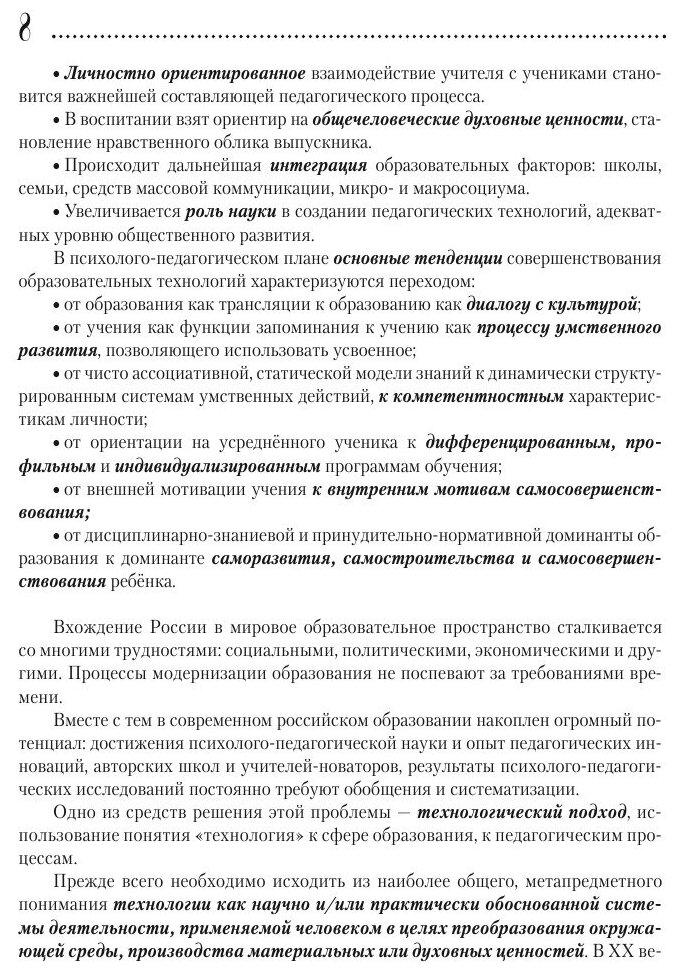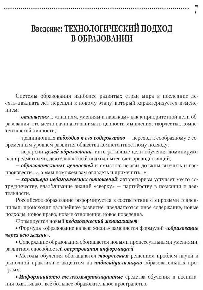 Книга представляет собой учебно-методическое пособие нового поколения. Представлены около 500 технологий обучения, воспитательных и социально-воспитательных технологий; в отдельной главе выделены педагогические технологии на оспине применения современных информационных средств Методологической основой книги стала концепция образовательной технологии Г.К. Селевко, согласно которой технология представляет собой совокупность трех основных взаимосвязанных компонентов: научного, формально-описательного и процессуально-действенного. В каждой из технологий четко прослеживается научно-концептуальная основа, излагаются суть и особенности содержания и применяемых методик, даётся необходимый для освоения материал. Характеристики технологий снабжены примерами их исторических и генетических прототипов (рубрика "Предтечи, разновидности, последователи"). В пособие также включены контрольные вопросы к содержанию глав и ответы па них.