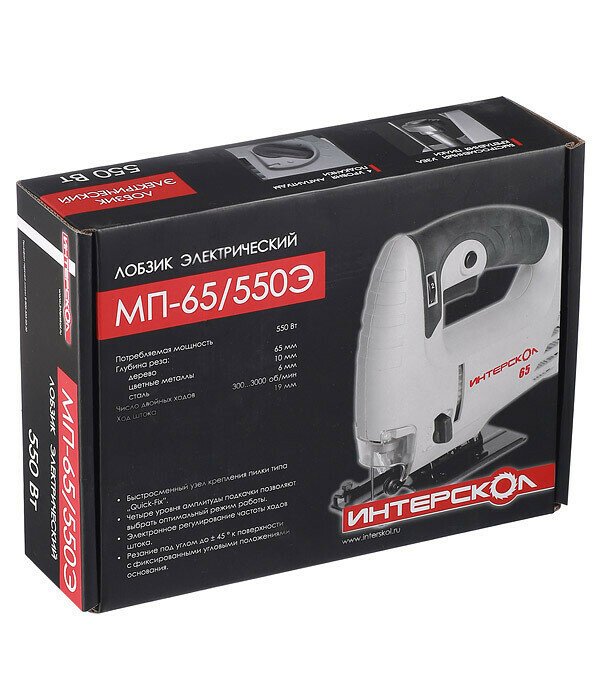 Лобзик ИНТЕРСКОЛ — универсальный бытовой инструмент для разнообразных пропилов: прямых, наклонных, фигурных. Подходит для раскроя дерева, фанеры, древесных плит, ламината и металлического профиля. При мощности в 550 Вт полотно движется с частотой до 2800 ходов/мин. Имеется маятниковый механизм, ускоряющий распил. Благодаря наклону подошвы можно резать под углом до 45° в обе стороны. Для отвода опилок и пыли предусмотрен патрубок. Вес лобзика — 2,1 кг.