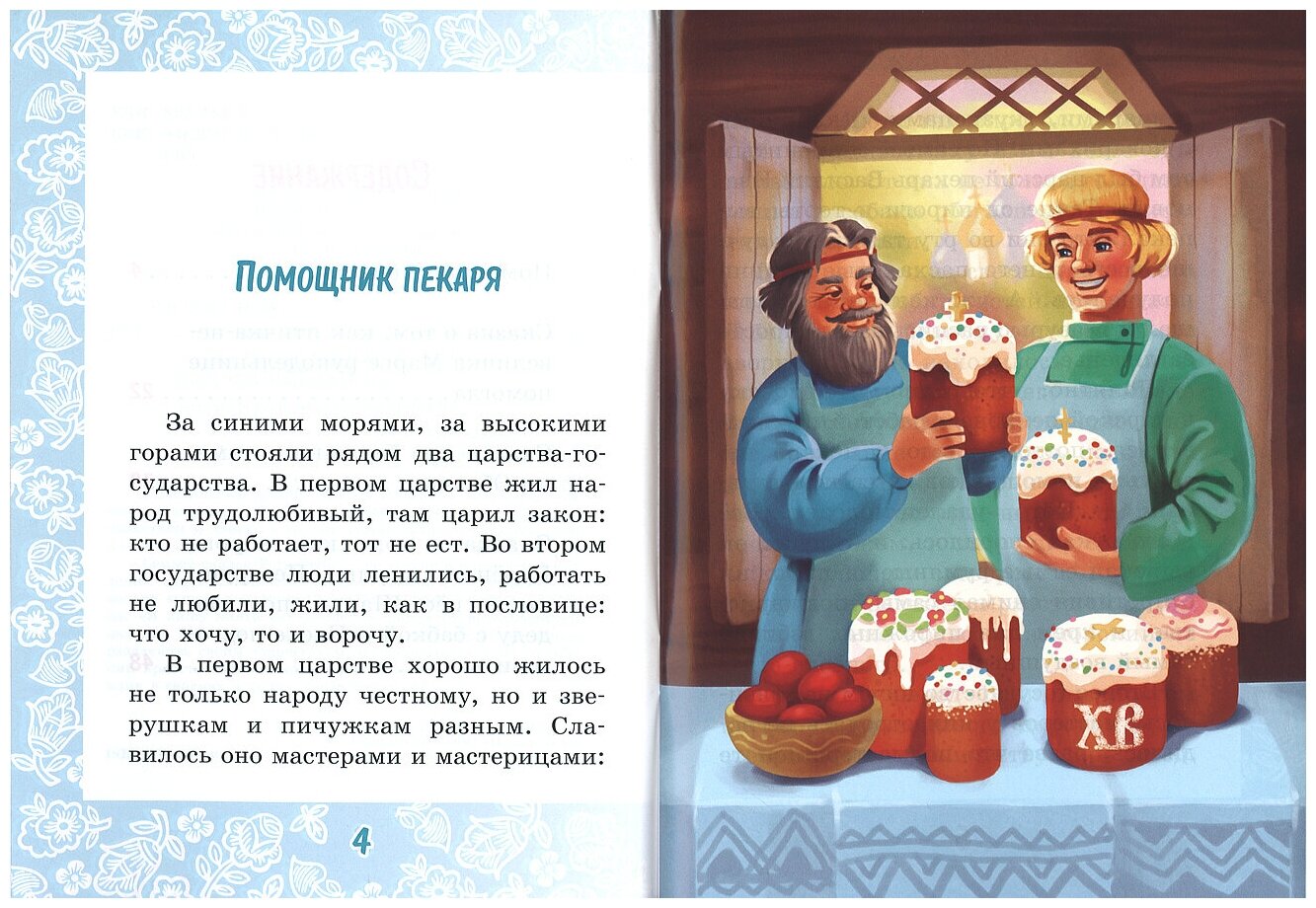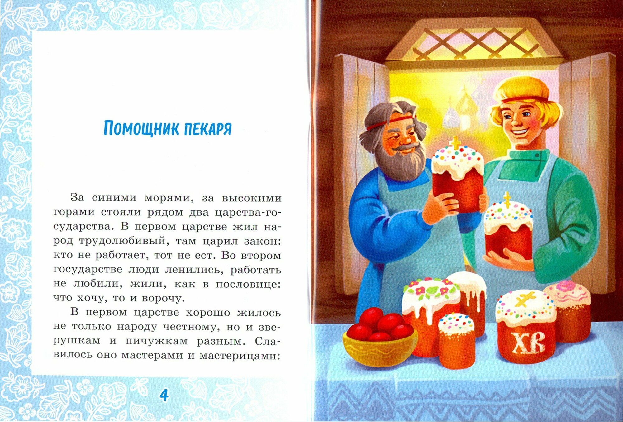 Первая история о помощнике пекаря, который перед Пасхой решил уйти жить в другое царство, которое уже разваливалось, т.к. люди не хотели ничего делать. Но потом он понял, что важно работать. А в том царстве после Пасхи началась новая жизнь. Вторая - о том, как выбирал купец невесту для сына, приказав сшить к Пасхе сарафан да рубаху, чтобы узнать, какие рукодельницы Марья и Дуня. В третьем - о барашек, который сначала пожадничал свой щерстки детям на варежки, и те замёрзли зимой и заболели. Но потом барашек всё-таки передумал. А на Пасху сбылась его мечта: он полетел вместе с облаками, чтобы посмотреть даньние страны. И в последней говорится о том, как животные помогли своим хозяевам- старикам встретить Пасху.