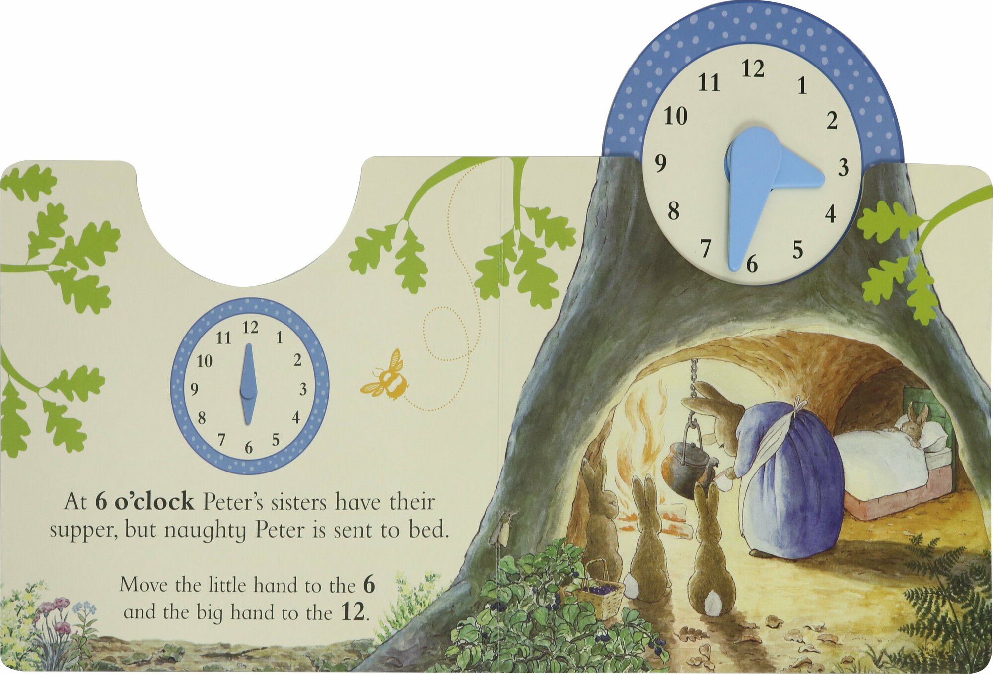 When is bedtime for Peter Rabbit? What time does Jeremy Fisher stop for a butterfly sandwich? Peter and his friends are busy at all times of the day. Turn the clicky-clacky clock hands to show the time of day on every page.