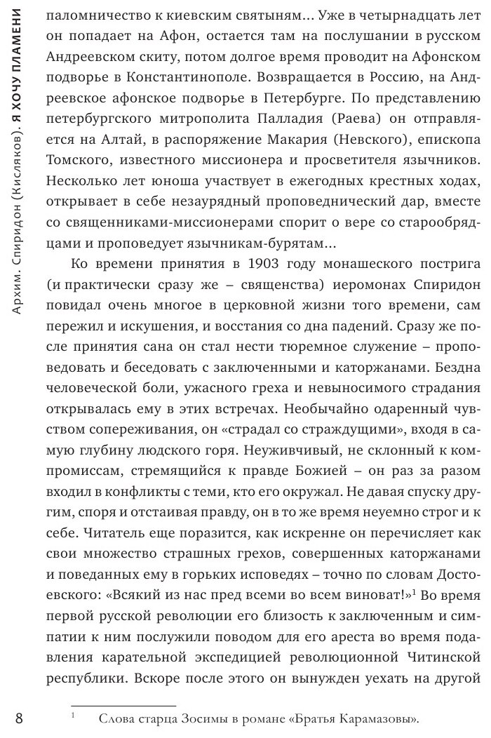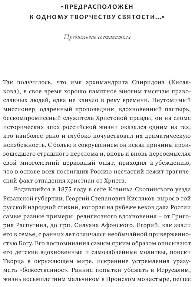 У книги, конечно, пафосная подача, но прочтение снимет все вопросы. Уникальный человек, уникальная судьба, уникальный опыт. Книга пронимает и своим мистическим измерением, и колоритным описанием реалий повседневной жизни православной России на рубеже XIX и XX веков. От некоторых мест буквально столбенеешь, настолько потрясают описанные архимандритом Спиридоном случаи и судьбы. Особенно, описание его поездки на Нерчинскую каторгу. А эпизоды миссионерской деятельности вызывают чувство восхищения простыми характерами неизвестных людей, встретившихся архимандриту Спиридону на дальних рубежах империи - навсегда ушедшая Россия, та самая, настоящая, со всеми своими противоречиями, поисками правды, суровой трагичностью и естественной красотой. Эта проникновенная книга о прошлом, но она очень хорошо помогает понять настоящее. Прочитайте ее и попробуйте посмотреть на мир вокруг глазами архимандрита Спиридона, особенно, на современную церковную жизнь.