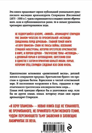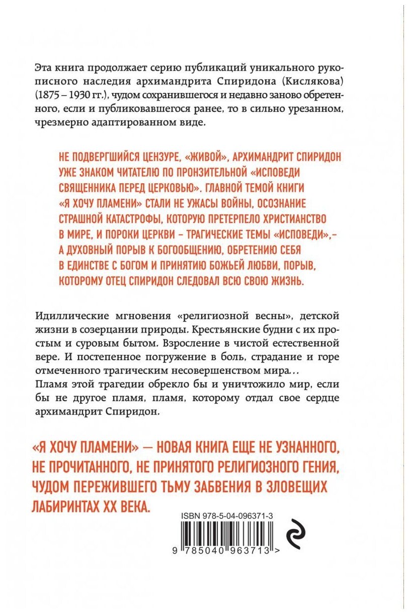 Эта книга продолжает серию публикаций уникального рукописного наследия архимандрита Спиридона (Кислякова) (1875-1930 г.), чудом сохранившегося и недавно заново обретенного, если и публиковавшегося ранее, то в сильно урезанном, чрезмерно адаптированном, виде. Не подвергшийся цензуре, "живой", архимандрит Спиридон уже знаком читателю по пронзительной "Исповеди священника перед Церковью". Главной темой книги "Я хочу пламени" стали не ужасы войны, осознание страшной катастрофы, которую претерпело христианство в мире, и пороки церкви - трагические темы "Исповеди" - а духовный порыв к богообщению, обретению себя в единстве с Богом и принятии Божьей любви, порыв, которому отец Спиридон следовал всю свою жизнь. Идиллические мгновения "религиозной весны", детской жизни в созерцании природы. Крестьянские будни с их простым и суровым бытом. Взросление в чистой естественной вере. И постепенное погружение в боль, страдание и горе отмеченного трагическим несовершенством мира… Пламя этой трагедии обрекло бы и уничтожило мир, если бы не другое пламя, пламя, которому отдал свое сердце архимандрит Спиридон.