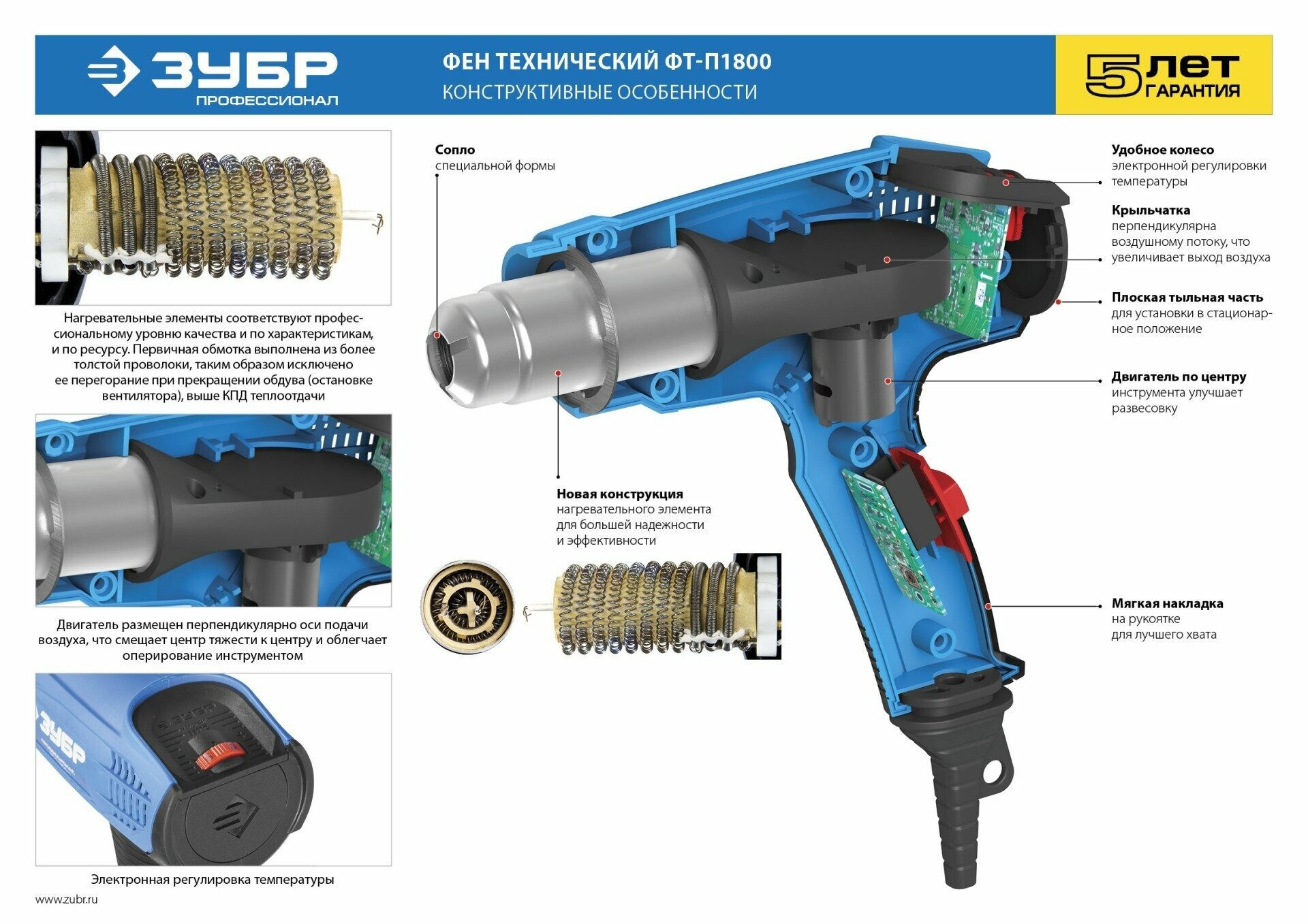Фен ЗУБР обладает улучшенной конструкцией с ламинарным воздушным потоком, усовершенствованным нагревательным элементом и керамическим изолятором. Благодаря электронной регулировке температуры, воздушного потока и потребляемой мощности, возможна работа с различными материалами. Ступень холодного обдува позволяет плавно охладить нагревательный элемент по окончании работы, что многократно продлевает его ресурс. Керамический изолятор для большей надежности.