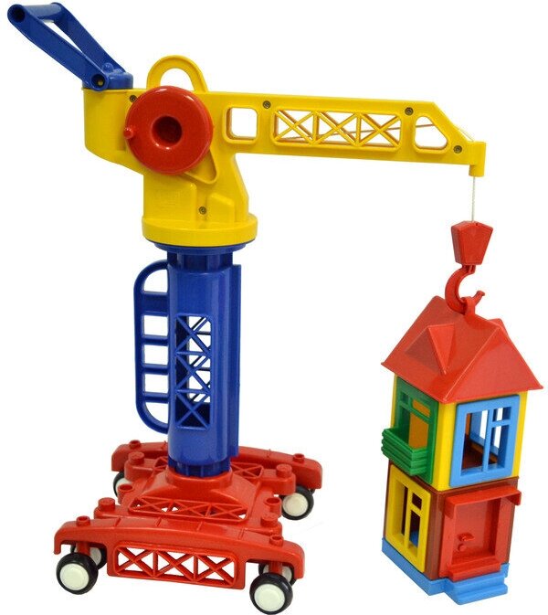 Игровой набор Строим дом из серии Детский сад от компании ПК Форма состоит из домика и строительного крана. Высокий кран установлен на специальной платформе. Благодаря колесикам, ее можно свободно перемещать. На конце крана имеется большой крючок, за который можно подцепить различные строительные элементы. Комплект подходит для сюжетно-ролевых игр и развивает воображение. Стрела поворачивается, трос наматывается на барабан с трещёткой, человечек вытаскивается. Панели домика, окна, двери и крыша разбираются и переносятся при помощи крана.