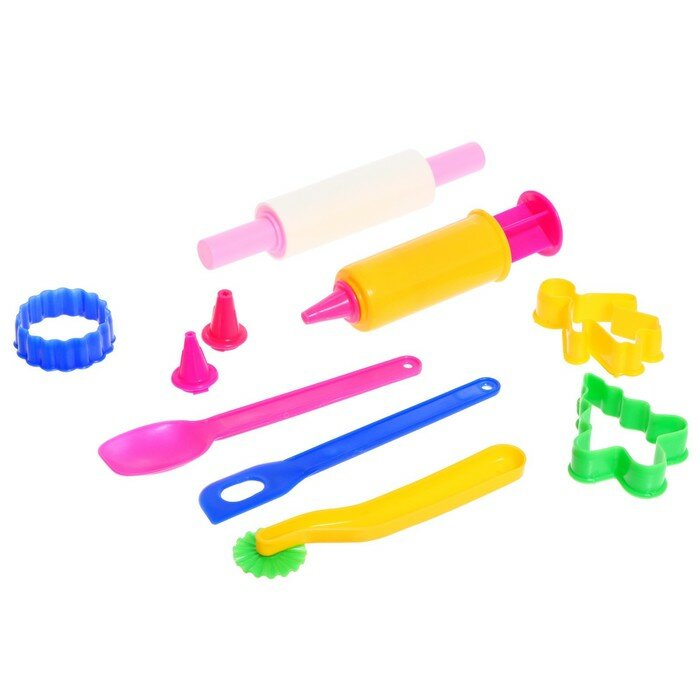 В игровом наборе Маленький кулинар имеются 10 предметов, предназначенных для сюжетно-ролевых игр на тему приготовления пищи. В комплекте есть и скалка, и формочки разных форм, и прочие принадлежности настоящего шеф-повара. Данный набор отлично подойдет как для развлечения, так и для изготовления всевозможных поделок.