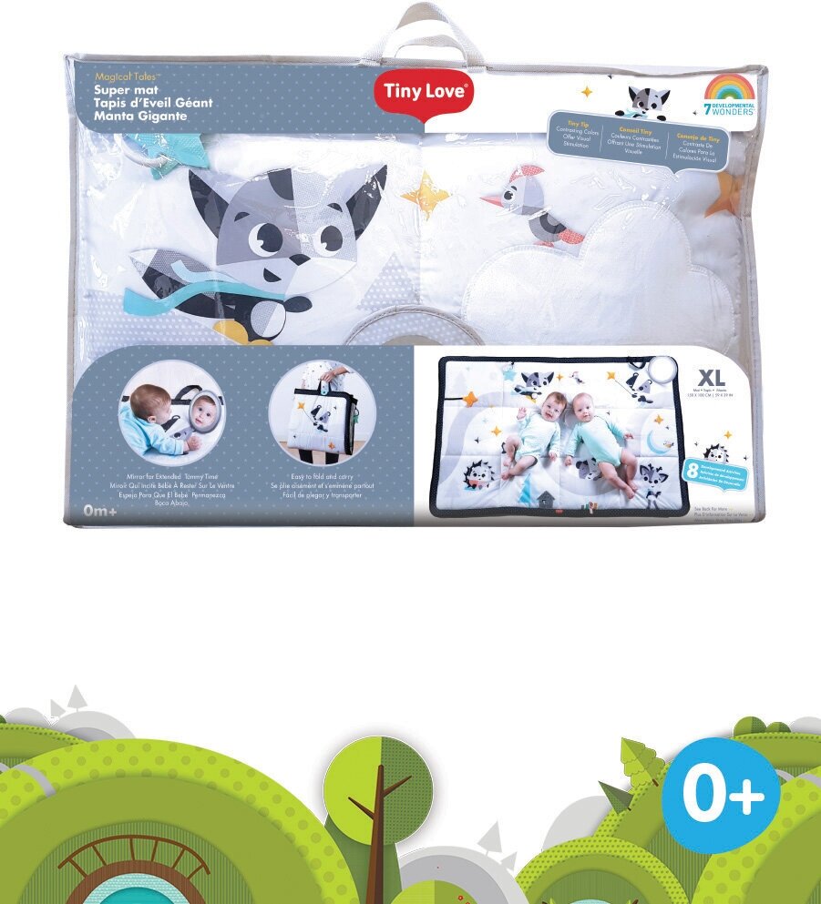 Новый дизайн коврика разработан с учетом особенностей зрения малышей в первый год жизни. Младенец постепенно учится удерживать свой взгляд на предметах, лучше всего концентрировать внимание получается на контрастных черно-белых картинках. На коврике «День и ночь» изображены любимые персонажи Тини Лав в черно-белой цветовой гамме. Кроме того, коврик стимулирует развитие других органов чувств, он имеет несколько занимательных элементов: кармашек, пуговицу, шуршащий листок, безопасное зеркало, разноцветные сатиновые ленточки и удобный прорезыватель.