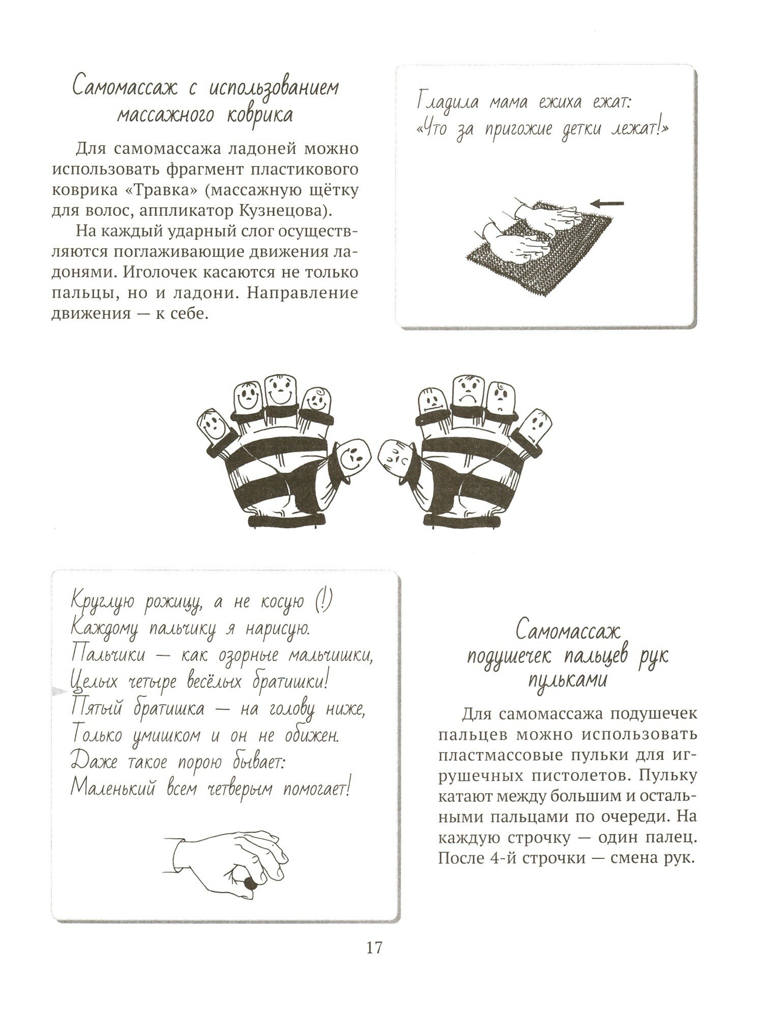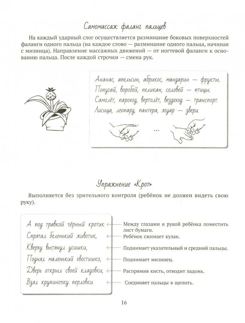 Безусловный плюс книги в том, что прописан план работы над крупной, мелкой и артикуляционной моторикой. Это очень удобно. К массажу рук прилагаются стишки, что способствует развитию речи, пополнению словаря.