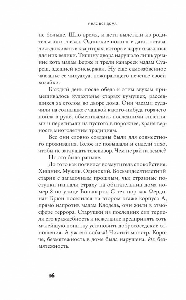 Маленький тихий городок. Улица Бонапарта, дом номер 8, корпус А, второй этаж, квартира слева от лифта. Именно сюда недавно после развода переехал восьмидесятидвухлетний Фердинан Брюн: нелюдимый мизантроп и хмурый скептик, человек, по мнению соседей, с мутным прошлым, заслуживший прозвище Маньяк-убийца. Особую ненависть вызывает он у местных старушек, привыкших перемалывать косточки всем жителям и с утра до ночи сплетничающих во дворе. Противостояние с жильцами проходит стадию холодной войны и рискует вылиться в жаркий конфликт, но тут на его пороге появляется одиннадцатилетняя девчонка, которая, подобно торнадо, врывается в его жизнь и переворачивает там все вверх дном. И это - лучшее, что случалось с ним за долгие-долгие годы.