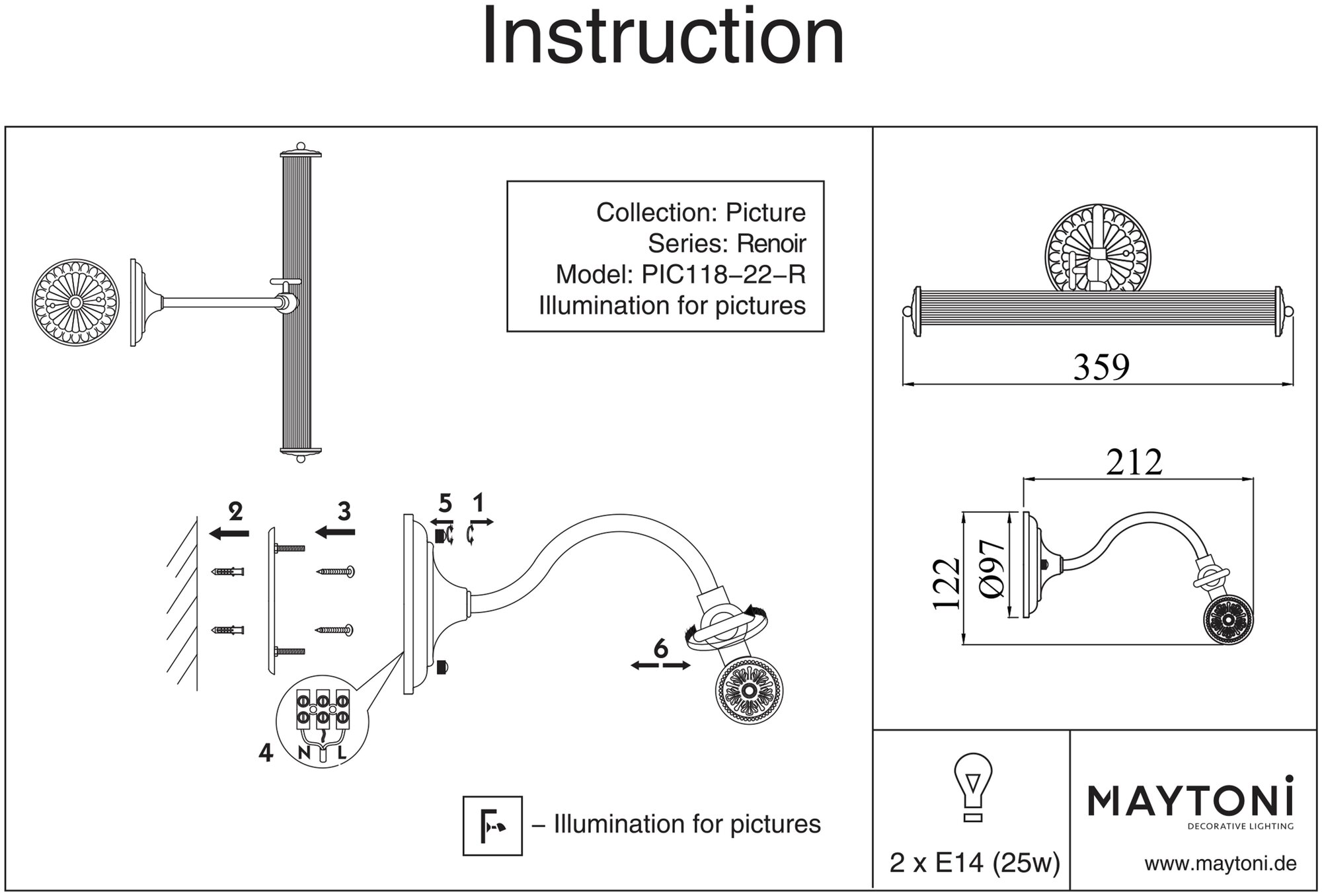 Подсветка для картин Renoir - продукт известной компании Maytoni (Германия). Имеет максимальную мощность 50 Вт, освещает площадь до 4 кв. м. Отлично подойдет для таких мест, как кабинет, прихожая и коридор. Впишется в интерьеры следующих стилей: классический.