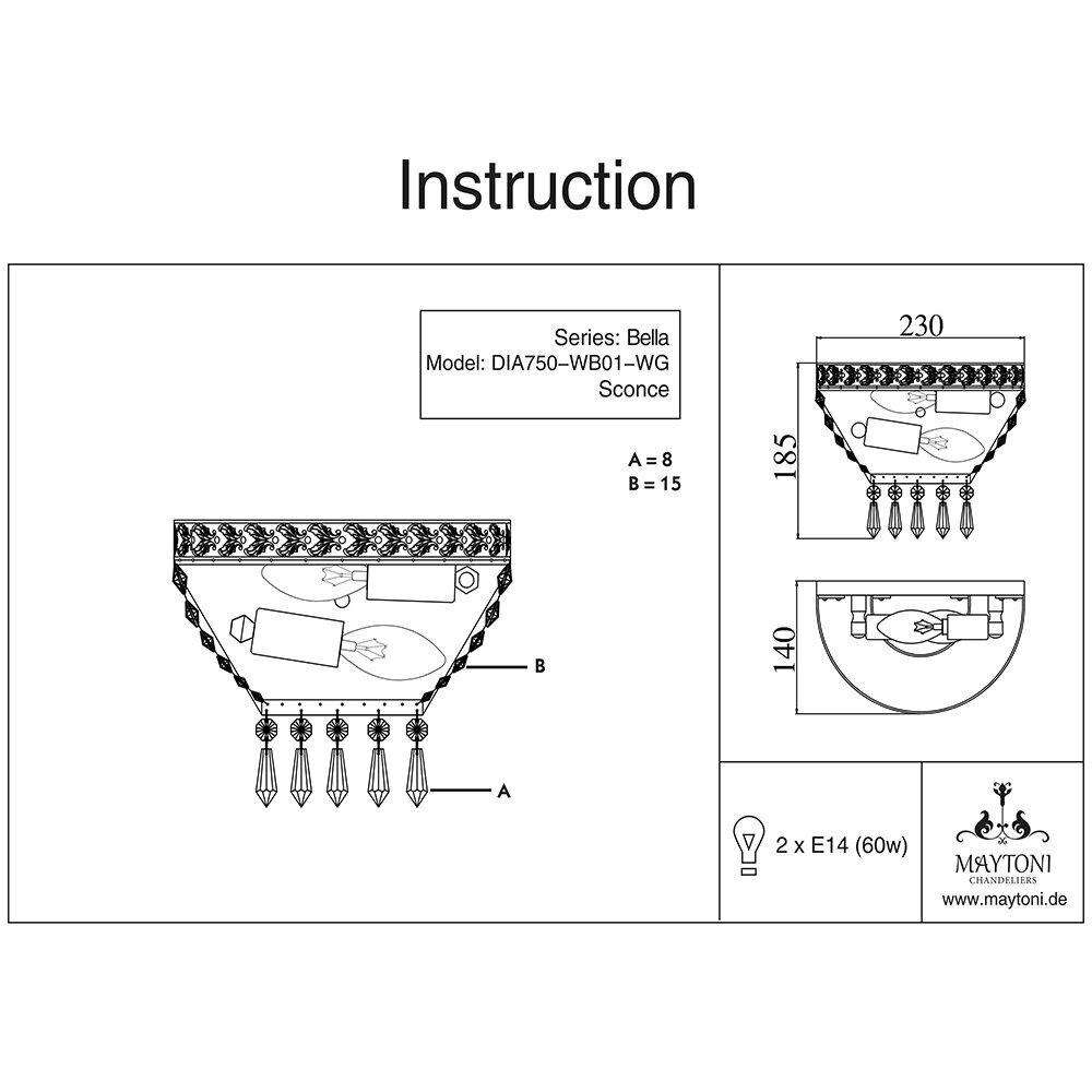 Бра из хрусталя Diamant 6 - продукт известной компании Maytoni (Германия). Имеет максимальную мощность 120 Вт, освещает площадь до 6 кв. м. Отлично подойдет для таких мест, как гостиная. Впишется в интерьеры следующих стилей: классический, ампир.