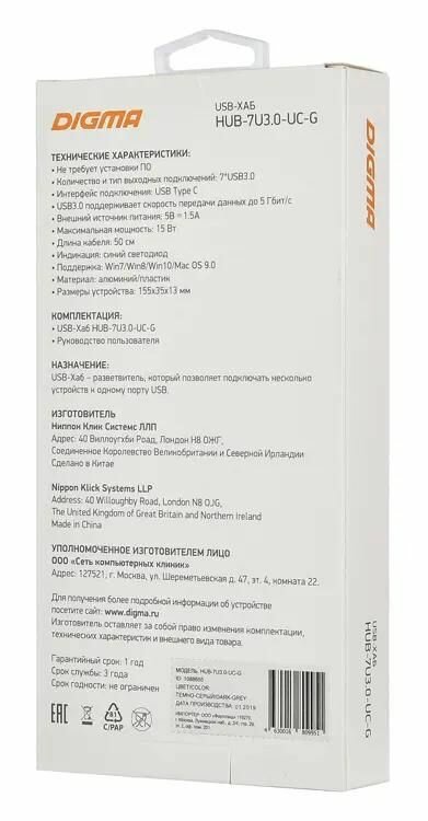 На сегодняшний день товар «Хаб (разветвитель) DIGMA серый HUB-7U3.0-UC-G (размер: 35х155х13 мм)» можно купить с кешбеком в 2 магазинах: E2e4online, Холодильник