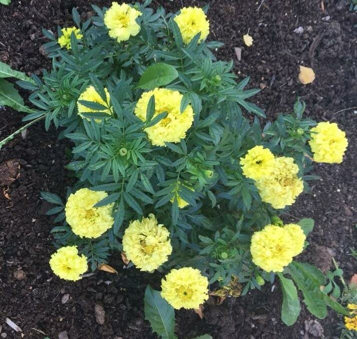 Однолетнее растение семейства Сложноцветные. Стебли прямостоячие, 55-70 см высотой, сильно ветвистые от основания. Соцветия - корзинки до 12 см в диаметре, с лимонно-желтыми многочисленными лепестками. Бархатцы используют во всех видах цветников. Они хорошо растут в горшках, вазонах, балконных ящиках, в сочетании с примулами и цинерариями. Осенью цветущие растения можно перенести в комнату, где они прекрасно растут в течение всей зимы. В открытый грунт можно высевать в конце мая - начале июня. Всходы появляются на 5-10 день. Почву желательно накрыть нетканым материалом (акрил, лутрасил). В этом случае сеять можно на неделю-полторы раньше обычных сроков и тем самым ускорить цветение. На рассаду сеют в начале апреля. Цветение начнется в июне. Бархатцы, высаженные рядом с огородными культурами уменьшают их поражение грибными заболеваниями, особенно фузариозом, защищают от некоторых видов нематод.