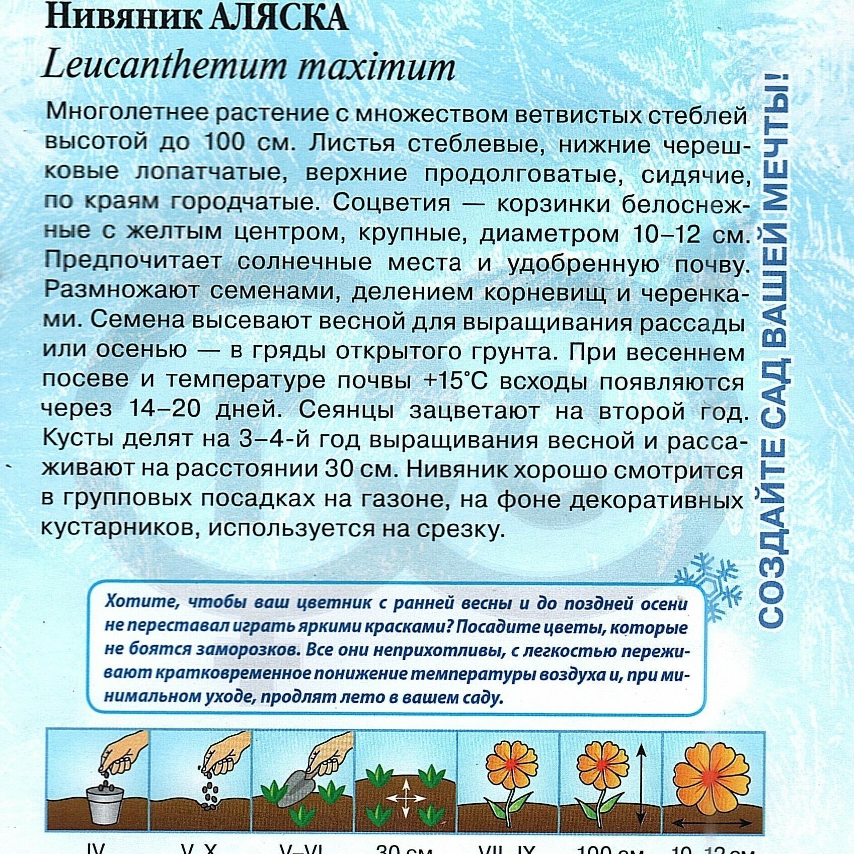 Многолетнее растение с множеством ветвистых стеблей высотой до 100 см. Листья стеблевые, нижние черешковые лопатчатые, верхние продолговатые, сидячие, по краям городчатые. Соцветия - корзинки белоснежные с желтым центром, крупные, диаметром 10-12 см. Предпочитает солнечные места и удобренную почву.Размножают семенами, делением корневищ и черенками. Семена высевают весной для выращивания рассады или осенью - в гряды открытого грунта. При весеннем посеве и температуре почвы 15 гр. Цельсия всходы появляются через 14-20 дней. Сеянцы зацветают на второй год. Кусты делят на 3-4-й год выращивания весной и рассаживают на расстоянии 30 см. Нивяник хорошо смотрится в групповых посадках на газоне, на фоне декоративных кустарников для срезки.