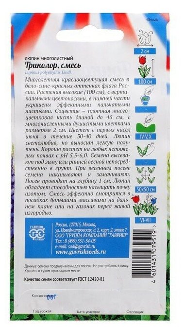 Многолетняя красивоцветущая смесь в бело-сине-красных оттенках флага России. Растения высокие (100 см), с вертикальными цветоносами, в нижней части украшены эффектными пальчатыми листьями. Соцветие-плотная, многоцветковая кисть длиной до 45 см, с многочисленными душистыми цветками размером 2 см. Цветет с первых чисел июня в течение 30-40 дней. Люпин светолюбив, но выносит легкую полутень. Хорошо растет на любых нетяжелых почвах с рН 5,5-6,0. Семена высевают под зиму или ранней весной непосредственно в грунт. Смесь эффектно смотрится в посадках большими массивами на дальнем плане или на газонах перед живой изгородью.