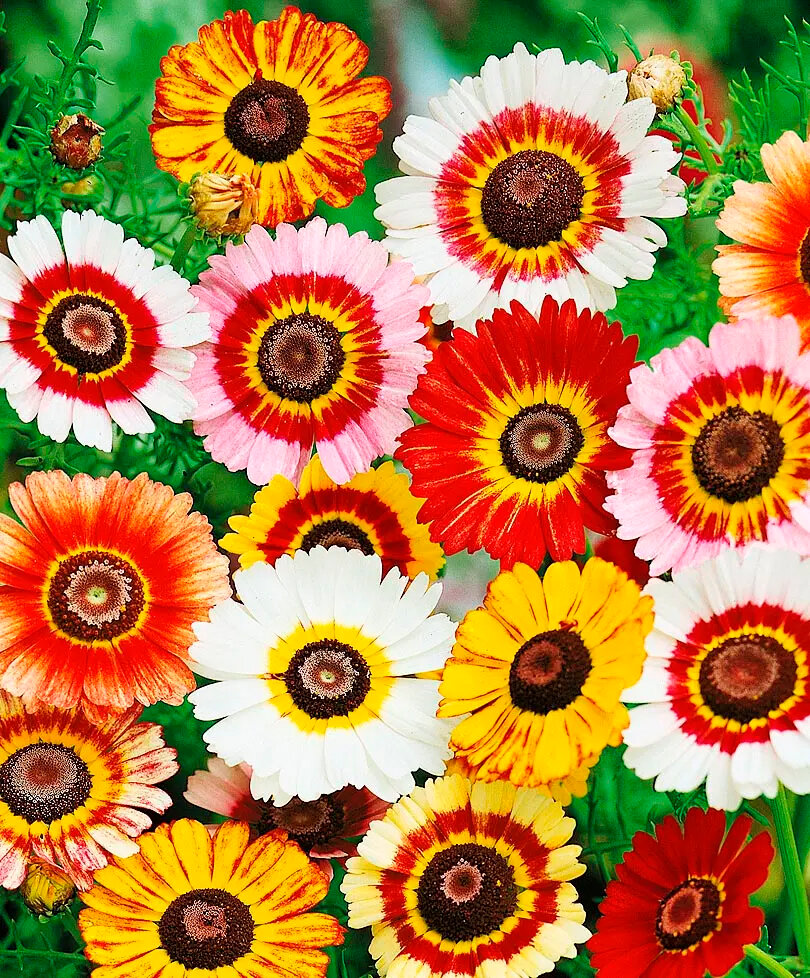 Однолетник. Куст прямостоячий, разветвленный, с ажурной ярко-зеленой листвой, высотой 40-60 см. Соцветия ромашковидные, простые и полумахровые, диаметром 5-7 см, разнообразных ярких окрасок. Цветение обильное, длится с июля по сентябрь. Используют для посадки в сборные цветники, рабатки, клумбы, а также для срезки. Агротехника: Хризантема - холодостойкое, засухоустойчивое, светолюбивое растение, предпочитает плодородные, хорошо дренированные почвы. Семена высевают в открытый грунт в мае или в августе под зиму. На рассаду посев проводят в марте. Температура прорастания семян 18 град. Ц. Всходы появляются через 7-10 дней. Сеянцы пикируют. После закаливания рассаду высаживают на постоянное место по схеме 35x40 см. Уход заключается в своевременных поливах, подкормках, рыхлении. Для лучшего ветвления молодые растения прищипывают.
