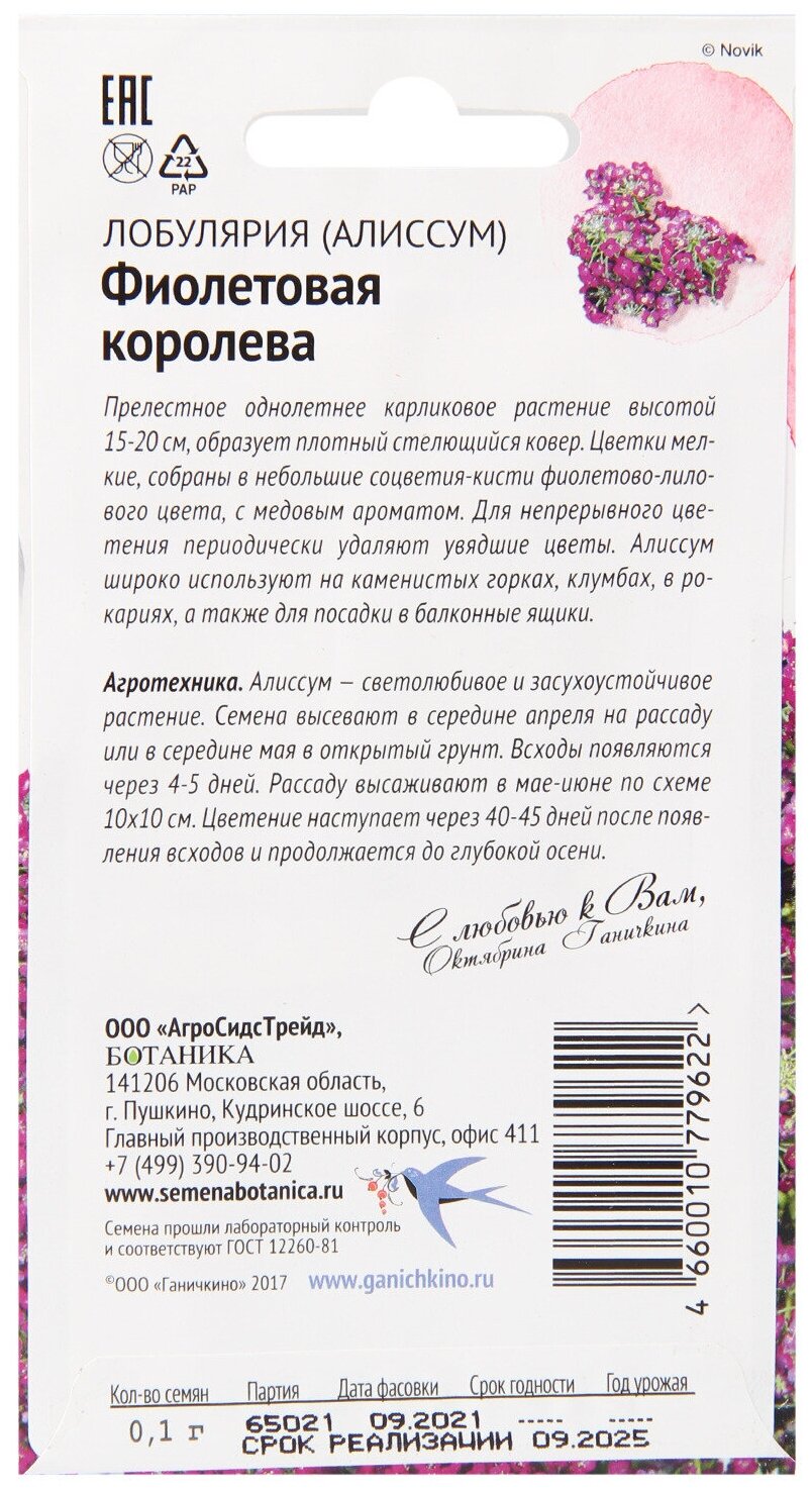 Модель: Алиссум Фиолетовая королева Семена от Октябрины Ганичкиной 0,1 гр
