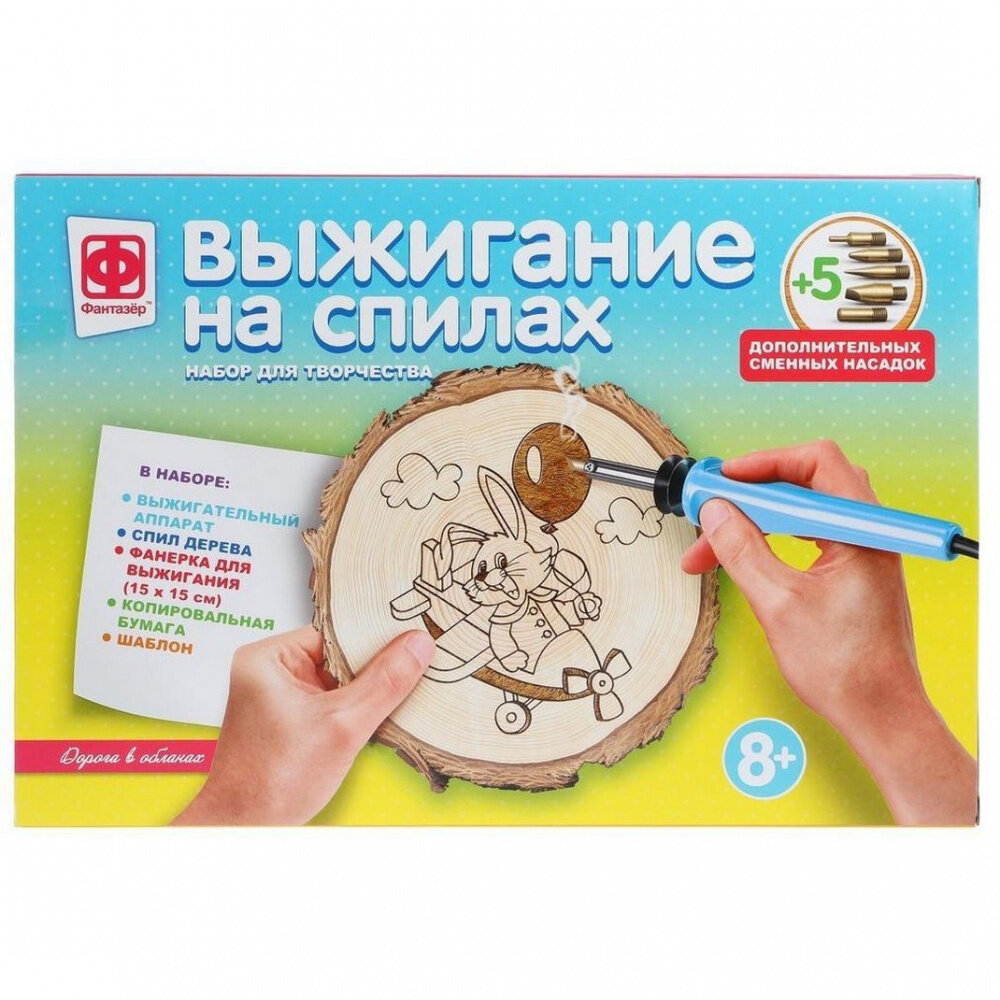 Набор: выжигательный аппарат со сменными насадками, фанера 15х15 см для выжигания, дерево, наждачная и копировальная бумага, шаблон, инструкция.