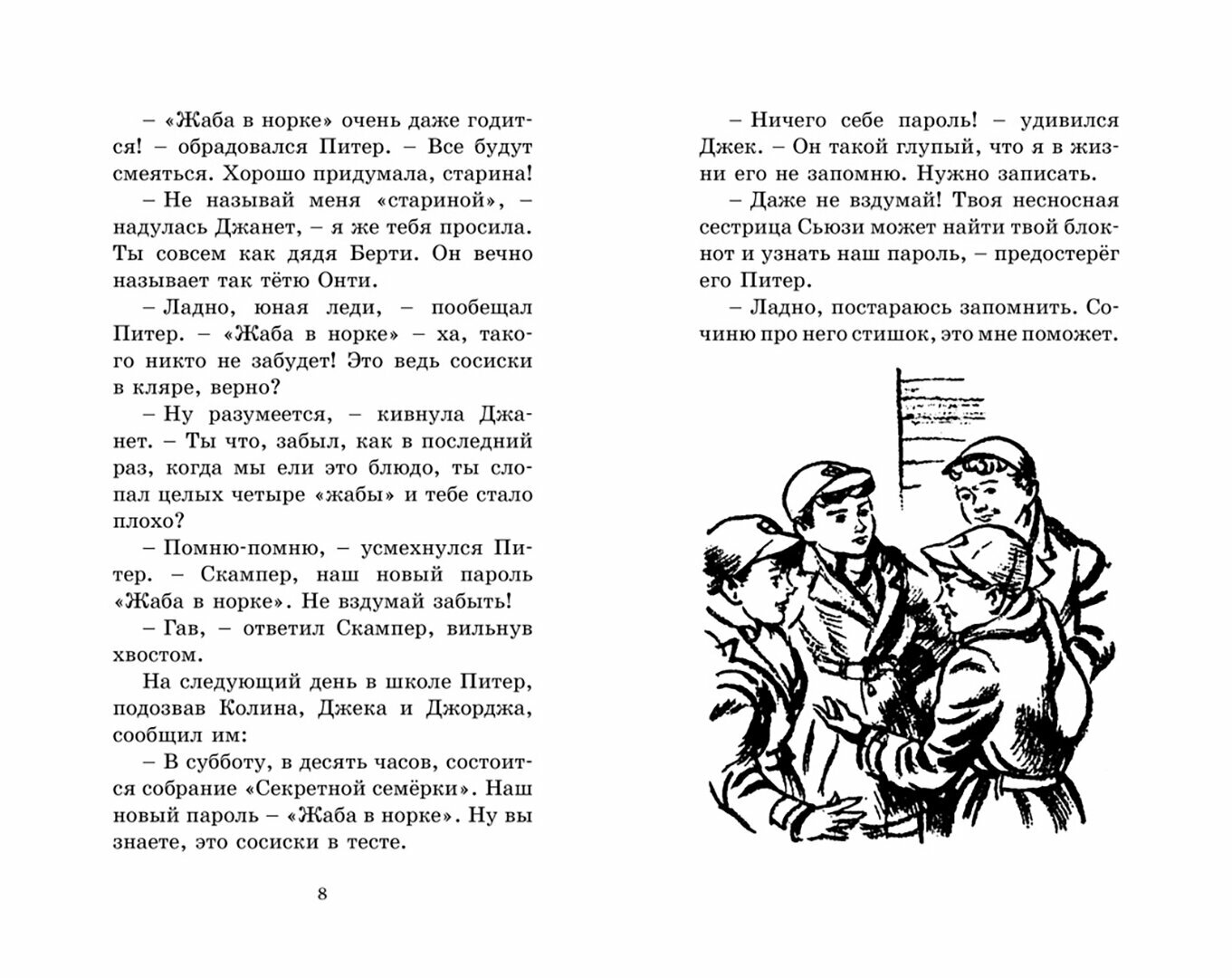 Аннотация очень заинтересовала ребёнка. Прочитал за три дня. Очень понравилась книга. Лёгкий слог, понятный язык. Хороший, качественный перевод. Книга входит в серию о семи ребятах, которые распутывают загадочные преступления. Качество печати отличное. Странички белые. Внутри небольшие иллюстрации, которые привлекают внимание ребёнка. Шрифт достаточно крупный для детских глаз. Обязательно будем читать остальные книги серии.