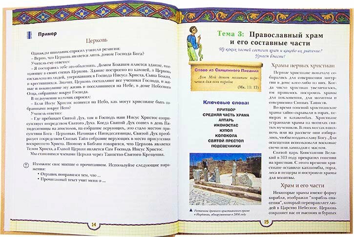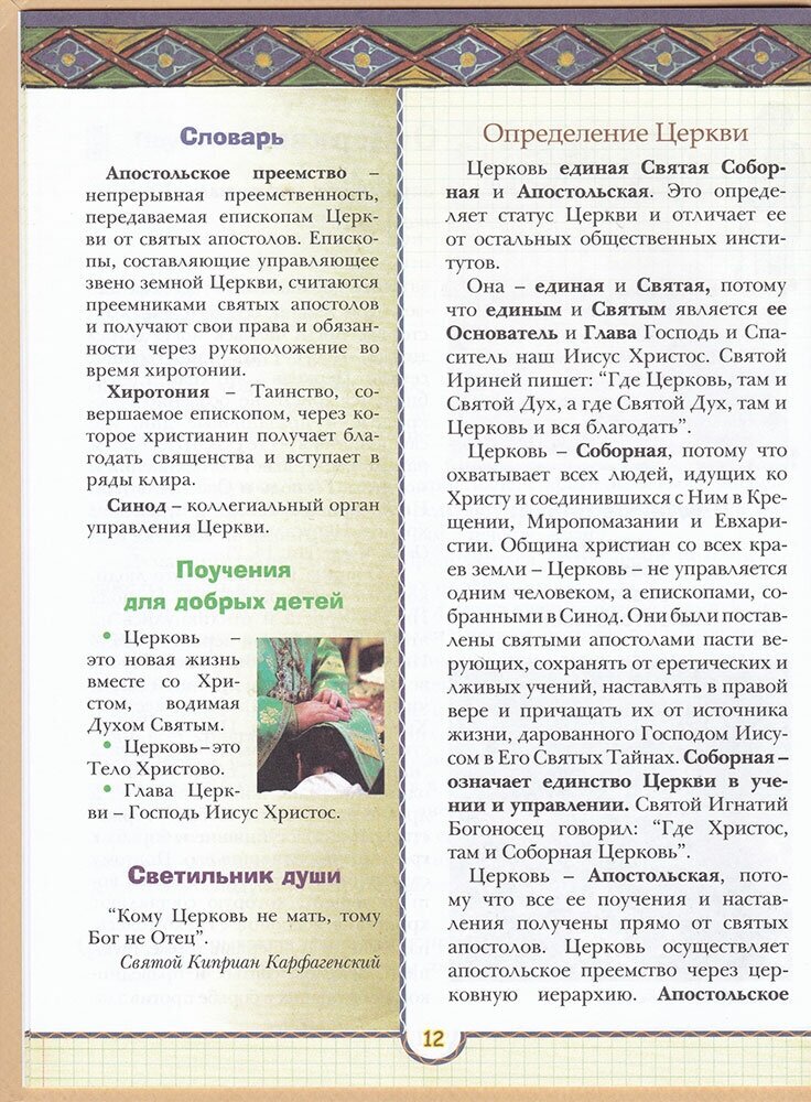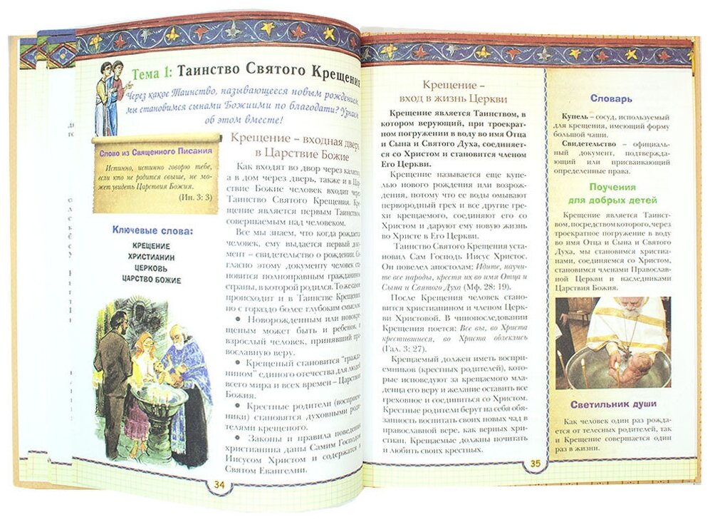 Это издание помогает решить задачу воцерковления ребенка. В процессе усвоения текста происходит формирование понятий об основных христианских догматах, Таинствах, церковном богослужении и смысле христианских добродетелей. Здесь нашлось место и для поучительных рассказов и для фрагментов из истории Церкви и для мини-игр и заданий, способствующих лучшему запоминанию прочитанного материала. Издание имеет структуру учебника и может быть использовано в учебных целях.