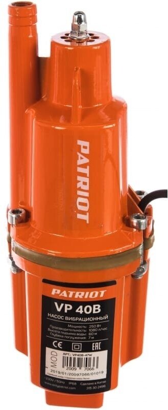 Колодезный насос для чистой воды Patriot , мощность 250Вт, вибрационный, погружной, производительность до 1080л/ч, высота подачи до 72м, глубина погружения до 7м (315302496)
