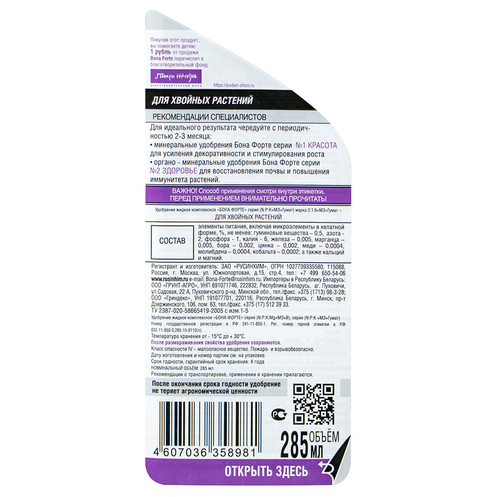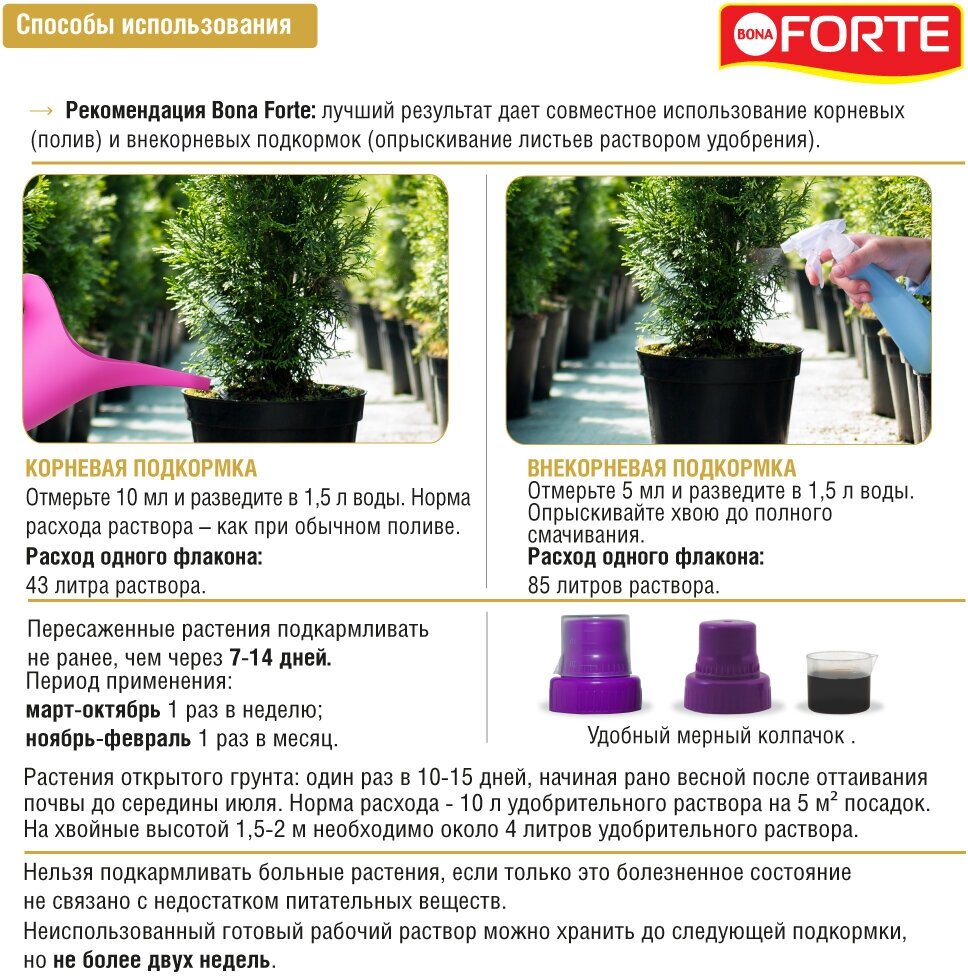 Проверенный бренд. Нареканий к его продукции не было ни разу. Bona Forte для хвойных серии "Здоровье" использовал для некорневой подкормки растений впервые. Инструкция позволяет применять удобрение для внекорневой подкормки хвойных, но концентрация не указана. В этой связи, опрыскивал половинной нормой, предписанной для корневой подкормки, в сочетании с обычным гранулированным удобрением этого же бренда в почву. В составе жидкого удобрения : гумат 0,5%, 9 микроэлементов и NPK 2;1;6. После 4-х подкормок за сезон хвойные выглядели хорошо: здоровый цвет, нормальный прирост, не болели. Рекомендую использовать в сочетании с жидким удобрением серией "Красота" . При этом считаю, что внесенного удобрения лучше слегка меньше рекомендуемого, чем больше.