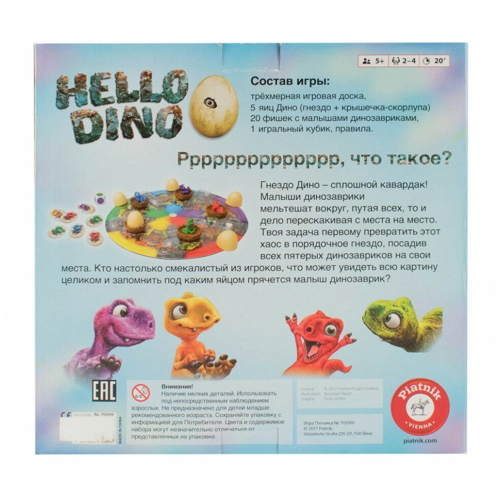 Piatnik Настольная игра Привет, Дино! - забавная настольная игра, рассчитанная на детей в возрасте от 5 лет. Ребятам необходимо навести порядок в гнезде динозавров. Для этого необходимо вернуть малышей-динозавров на свои места. Задача усложняется тем, что динозаврики скрыты яйцами, а само гнездо постоянно вращается вокруг собственной оси. Игра поможет развить память, внимательность и быстроту реакции. В комплекте: круглое 3D поле для игры 5 яиц с фигурками динозавриками внутри 20 фишек динозавров кубик подробные правила игры на русском языке В игре могут принимать участники в количестве от двух до четырех человек. Среднее время игровой партии составляет 20 минут.