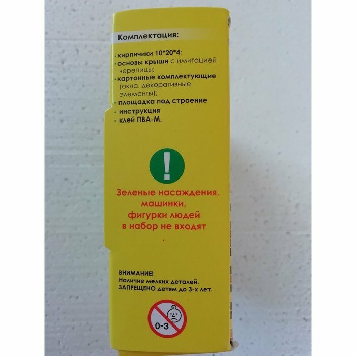 | Состав набора | кирпичики 1х2х0.4 см х 1240 шт,основы крыши с имитацией черепицы,картонные комплектующие - подоконники/окна,двери/декоративные элементы,площадка под строение с имитацией ландшафта,клей ПВА-М |
