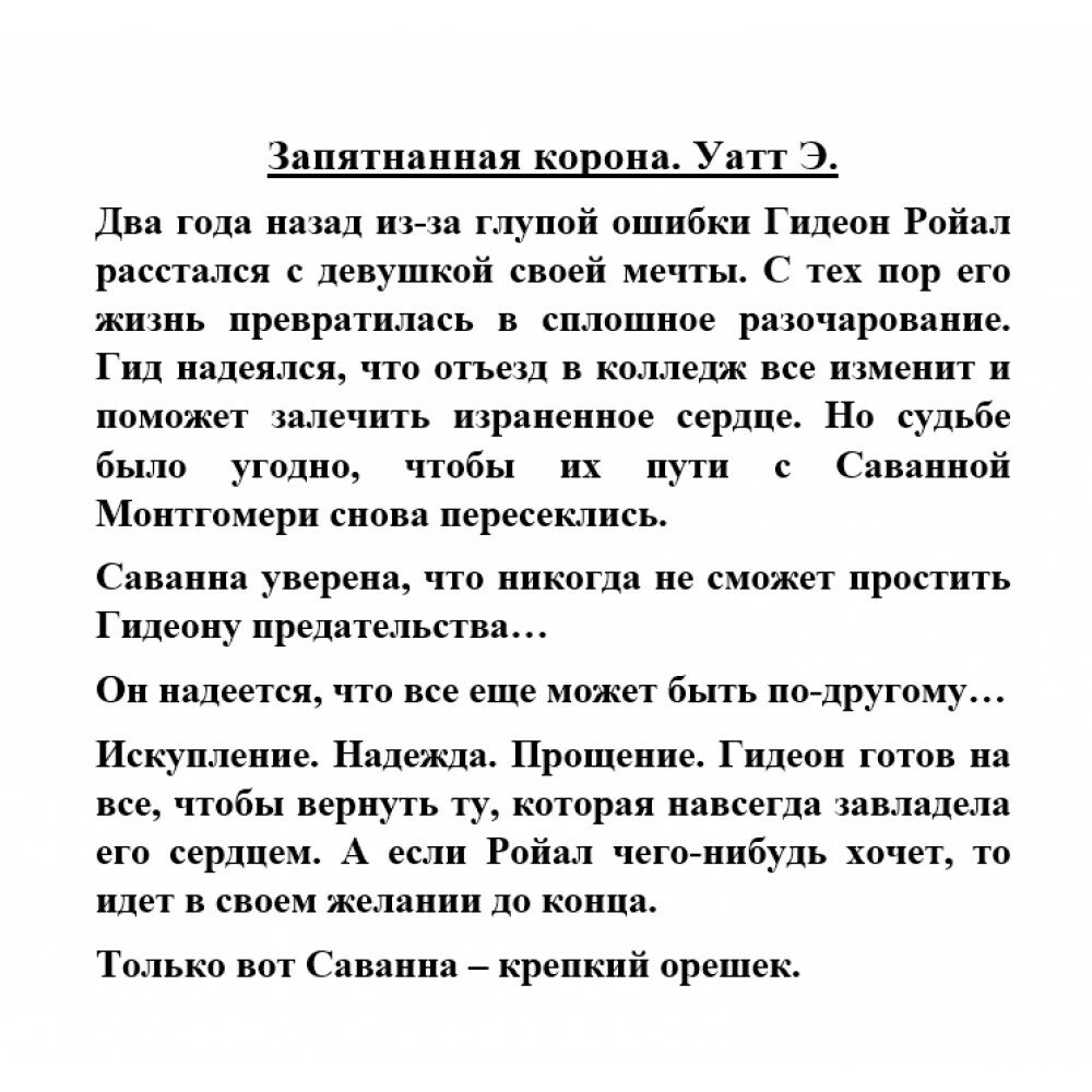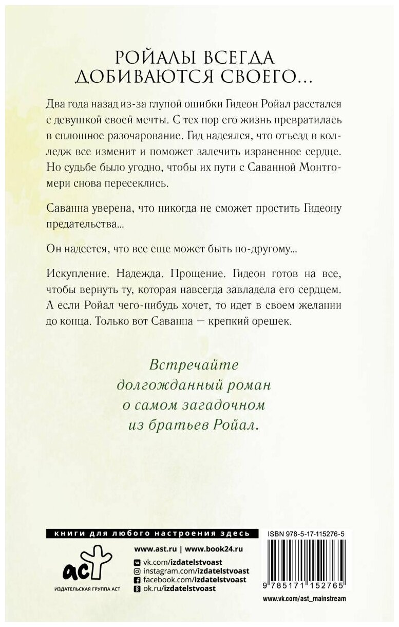 Два года назад из-за глупой ошибки Гидеон Ройал расстался с девушкой своей мечты. С тех пор его жизнь превратилась в сплошное разочарование. Гид надеялся, что отъезд в колледж все изменит и поможет залечить израненное сердце. Но судьбе было угодно, чтобы их пути с Саванной Монтгомери снова пересеклись.