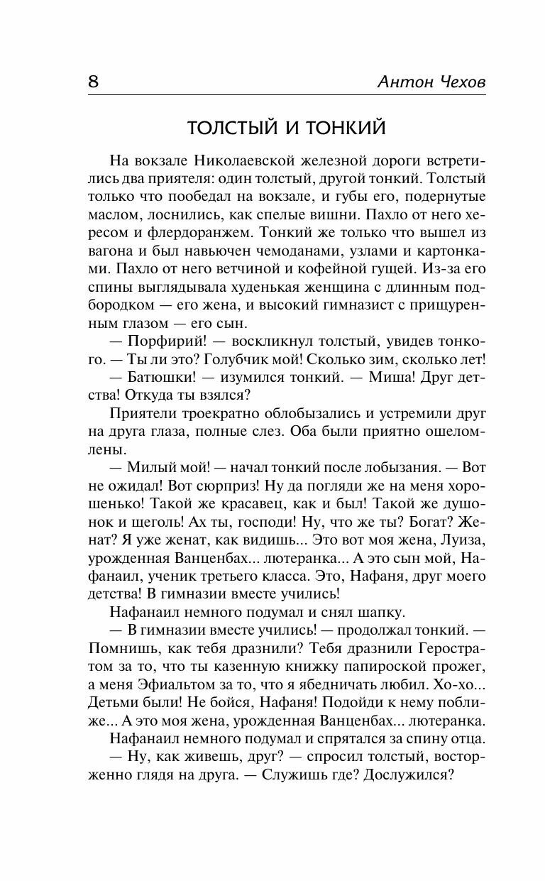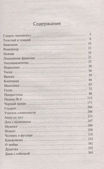 Издание просто замечательное. В нем есть все рассказы, изучаемые в средней школе, - и юмористические ("Смерть чиновника", "Толстый и тонкий", "Хамелеон"), и драматические ("Тоска", "Ионыч", "Дама с собачкой", "Дом с мезонином", "Палата №6", "Душечка", "Попрыгунья", маленькая трилогия). Если для кого-то важно - бумага сероватая и не очень плотная, некрупный шрифт. Но благодаря этому книга легкая, её удобно носить с собой (несомненный плюс для школьников). И цена гораздо ниже, чем за уступающие этому изданию аналоги. В качестве рабочего варианта - просто идеал. Я очень довольна. Другие сборники в данной серии на программу по литературе ориентированы в меньшей степени (например, у Бунина не подбирали рассказы, а оставили целиком авторский цикл "Темные аллеи").