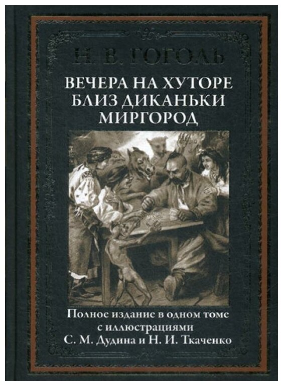 Иллюстрации, вошедшие в эту книгу, впервые увидели свет в 1911 году в издательстве Альфреда Федоровича Девриена. В предисловии художники Самуил Мартынович Дудин-Марцинкевич и Николай Иванович Ткаченко писали: ОТ ИЛЛЮСТРАТОРОВ "Вечера на хуторе близ Диканьки" и "Миргород" иллюстрировались многими художниками в целом ряде изданий. Однако, если не считать большого альбома, изданного лет 30 тому назад и посвященного исключительно "Вечерам", все остальные издания, рассчитанные на широкий рынок, оставляют многого желать в смысле опрятности и изящества. Иллюстрации в большинстве из них по разным причинам, часто несмотря на значительные достоинства, отличаются отсутствием единства и сколько-нибудь определенного плана не только для всей серии рассказов, но зачастую и для одного и того же рассказа, являясь поэтому несколько случайными и слабо вяжущимися с текстом. Многие же из них, благодаря тому, что отправной точкой художниками было взято и утрировано то смешное, что есть в рассказах, на наш взгляд, еще дальше отошли от текста. Нам давно хотелось попытаться исправить указанные сейчас недостатки рисунков и изданий. Готовность А. Ф. Девриена помочь нам в этом позволила осуществить нашу мысль, а многолетняя совместная работа и знание быта Малороссии давали нам надежду на то, что мы сможем справиться с этой задачей. А. Ф. Девриен не пожалел затрат для того, чтобы придать изданию красивую внешность и солидность, необходимые для книги, предназначенной для любителей красивых изданий и для подарков. Представляя теперь вниманию читателей "Вечера на хуторе близ Диканьки" и "Миргород" с нашими рисунками и набросками - углем и пером - мы, конечно, далеки от того, чтобы думать, что они вполне исправляют недочеты прежних иллюстраций. Нам чужда была мысль определить пером и углем во всем богатом разнообразии и полноте красивые образы Гоголя. Мы хотели только дать читателям подходящий, не противоречащий духу гоголевского текста изобразительный материал, правдивый, не сдобренный ни карикатурой, ни шаржировкой и не прикрашенный по-театрально-праздничному, а такой, каким сохранила его наша память от тех лет, когда мы сами жили и росли среди мест и типов, описываемых Гоголем. И если наши рисунки помогут читателю несколько живее перенестись мыслью в ту же среду и обстановку, если те бытовые мелочи и подробности, о которых Гоголь упоминает вскользь и которые мы намечаем определенно, дополнят это, мы будем считать нашу задачу исполненной. Насколько мы подошли к ее решению - судить, конечно, не нам. С. М. Дудин Н. И. Ткаченко В сборник вошли двенадцать первых повестей классика русской литературы Николая Васильевича Гоголя (1809-1852). Книга оформлена работами мастеров книжной иллюстрации Николая Ивановича Ткаченко (1866-1913) и Самуила Мартыновича Дудина-Марцинкевича (1863-1929).