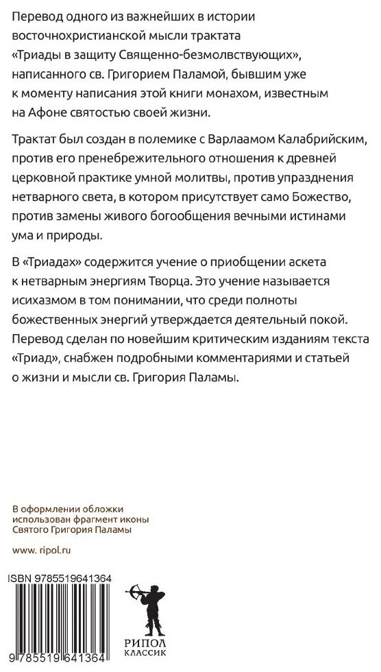 Перевод одного из важнейших в истории восточно-христианской мысли трактата "Триады в защиту священно безмолвствующих", написанного св. Григорием Паламой, бывшим уже к моменту написания этой книги монахом, известным на Афоне святостью своей жизни.