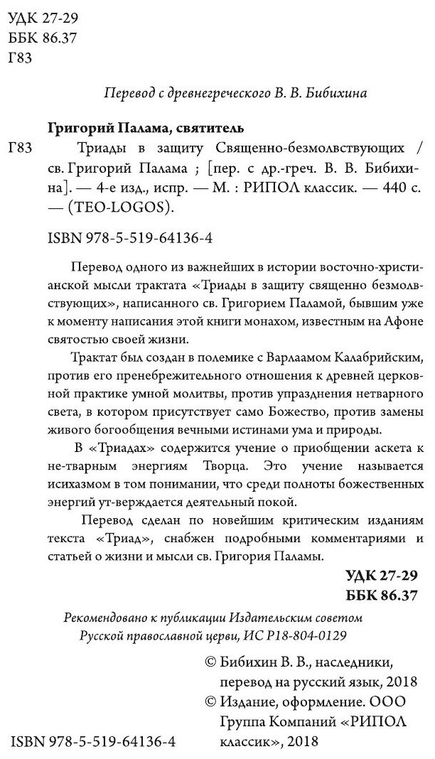 Перевод сделан по новейшим критическим изданиям текста "Триад", снабжен подробными комментариями и статьей о жизни и мысли св. Григория Паламы.