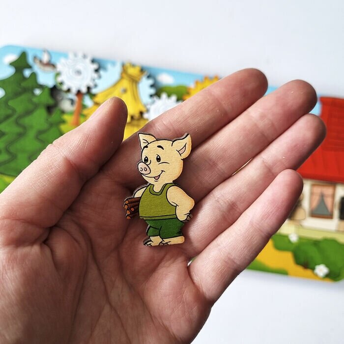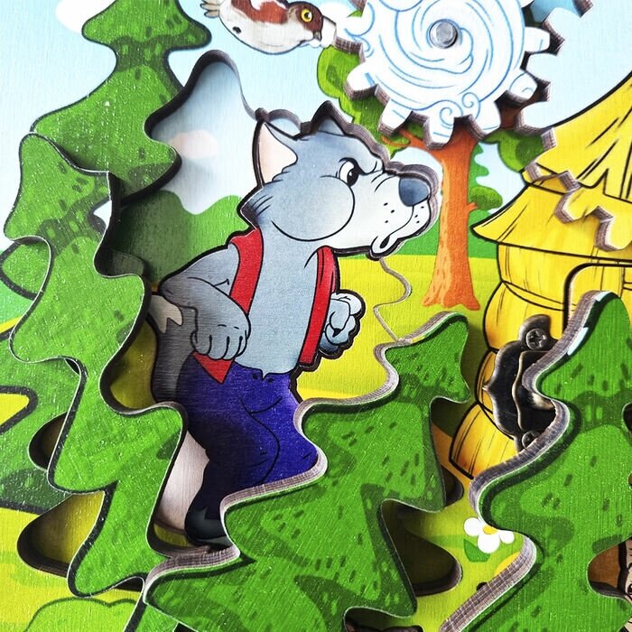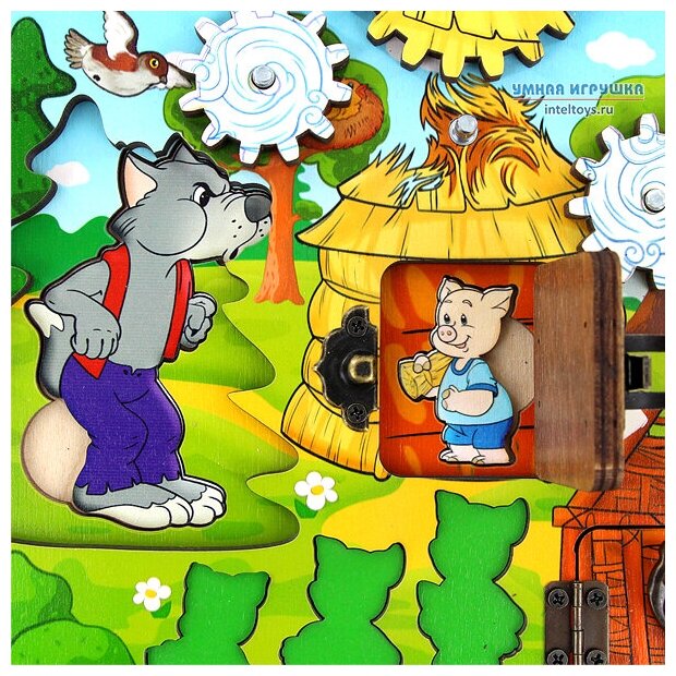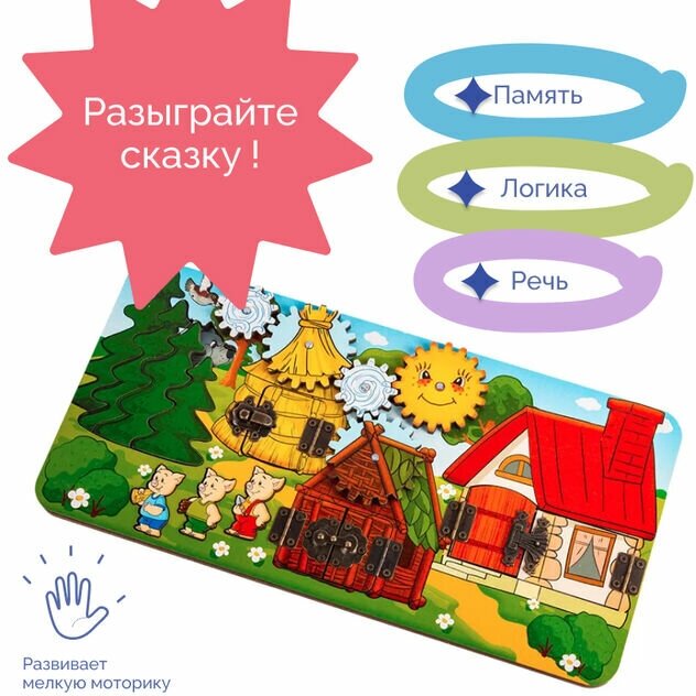 Развивающая доска бизиборд «Три поросёнка» – это обучающая игрушка по мотивам известной детской сказки.Лёгкая прямоугольная доска из прочной берёзовой фанеры имеет несколько домиков с открывающимися дверцами, подвижные шестерёнки и элементы вкладышей-пазлов. Все дверцы закрыты на разные безопасные замочки. Перед началом игры снимите с игровой доски две шестеренки с изображением ветра и отложите их в сторону.Вспомните содержание сказки или перечитайте её. Попросите ребенка внимательно рассмотреть игровую доску. Задавайте наводящие вопросы.Из каких материалов построили поросята свои домики? Почему? В каком домике живет каждый поросенок?Предложите малышу открыть дверцы и спрятать каждого поросенка в том домике, который ему принадлежит. Разберите пазл из елок, достаньте волка, который притаился за ними, и положите елки обратно.Какие домики волку удалось разрушить, а какой нет? Почему? Как он это сделал? Возьмите одну шестеренку с изображением ветра, разместите ее на штырьке слева от крыши соломенного домика и положите волка рядом.Изобразите, как волк дует на соломенный домик, покрутив шестеренку. Что происходит с крышей? Снимите большую шестеренку и посмотрите, что случилось с домиком.Попросите малыша «спасти» поросенка от голодного волка, переместив его в более крепкий домик из веток. Что же происходило дальше? Разместите вторую шестеренку с изображением ветра рядом с домиком, в котором спрятались поросята. После того, как волк как следует «подует» на домик (крутите маленькую шестеренку), посмотрите, удалось ли ему сломать домик, сняв большую шестеренку. Как спаслись поросята? Где они спрятались?Попросите ребенка достать поросят из сломанного домика и помочь им укрыться в надежном каменном доме, где никакой серый волк будет им не страшен. А что случилось с волком в конце сказки? В процессе игры можно придумывать разные истории про волка и поросят. Например, какой поросенок может пригласить в гости своих братьев, какой только одного, а какой не может пригласить никого, потому что его домик очень маленький? Сможет ли волк дуть так сильно, чтобы сломались крыши одновременно у двух домиков? Каким образом для этого нужно расставить шестеренки?Малыш точно будет рад встретить героев любимой сказки, поиграть за них и помочь победить злого волка.Такой бизиборд станет очень действенным способом тренировки мелкой моторики.Занятия с бизибордом формируют у ребёнка определенные умения и навыки, развивают познавательность и интеллектуальные способности.