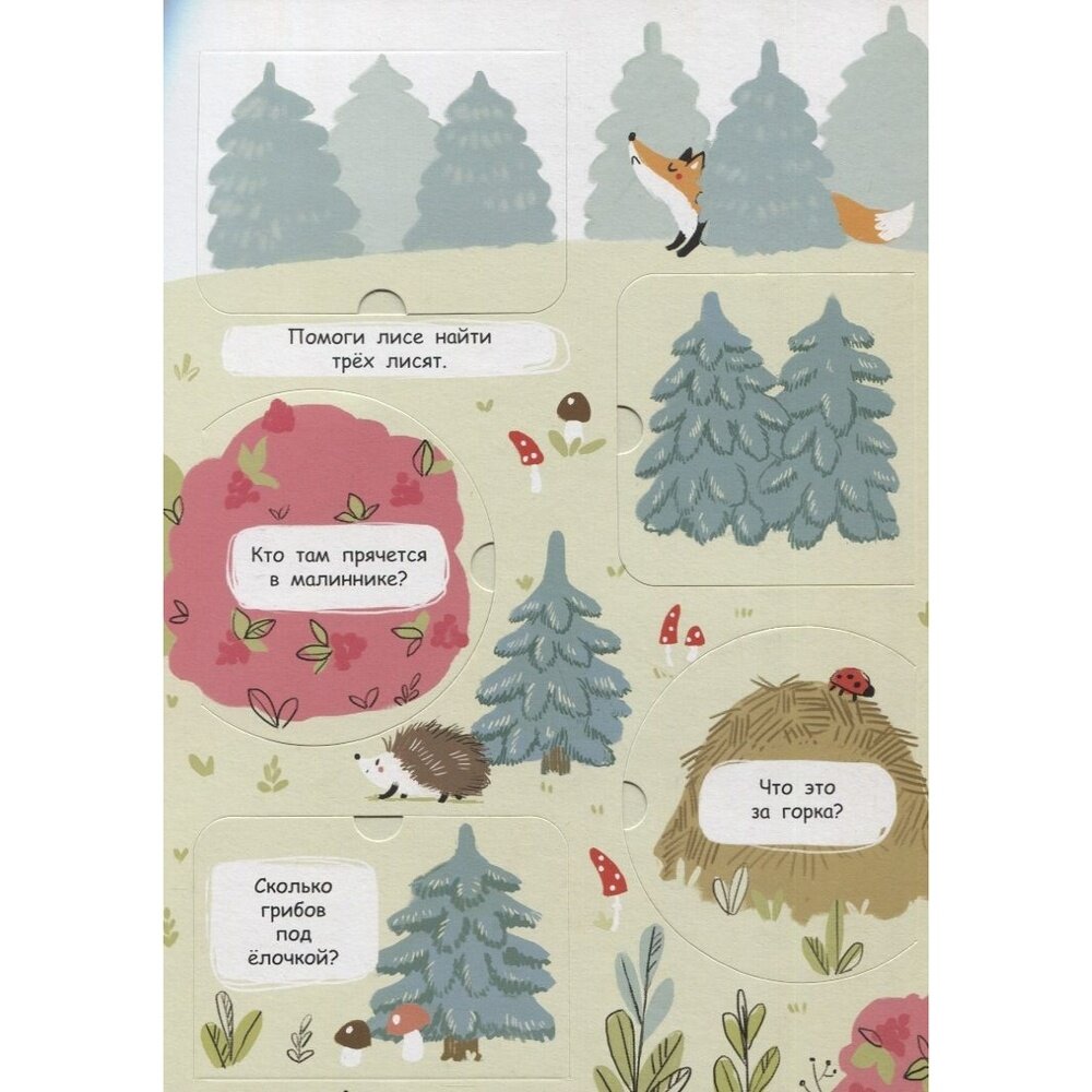 Брала двухлетнему ребенку, достаточно неусидчивому. Формат А4 , картонные странички, которые легко переворачивать самому. На каждом развороте 5 окошек. Понравилось, что окошки большие, с небольшой помощью ( нужно слегка поддеть) тоже открывает сам. Про белочек, которые особенно приглянулись, придумали и сказку. После выходных утянул книжку в сад, а это значит, что она понравилась.