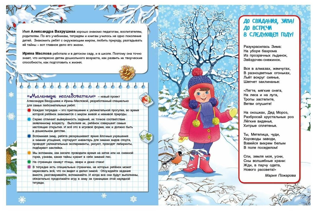 На страницах оживут птицы, звери и даже стихи! В тетрадке есть специальные странички, на которых ребёнок может нарисовать всё, что он видел и делал зимой. Обсуждайте задания вместе, разговаривайте, вспоминайте. И когда все они будут выполнены, обязательно продолжайте игру в зиму за границами этой нарядной тетради.