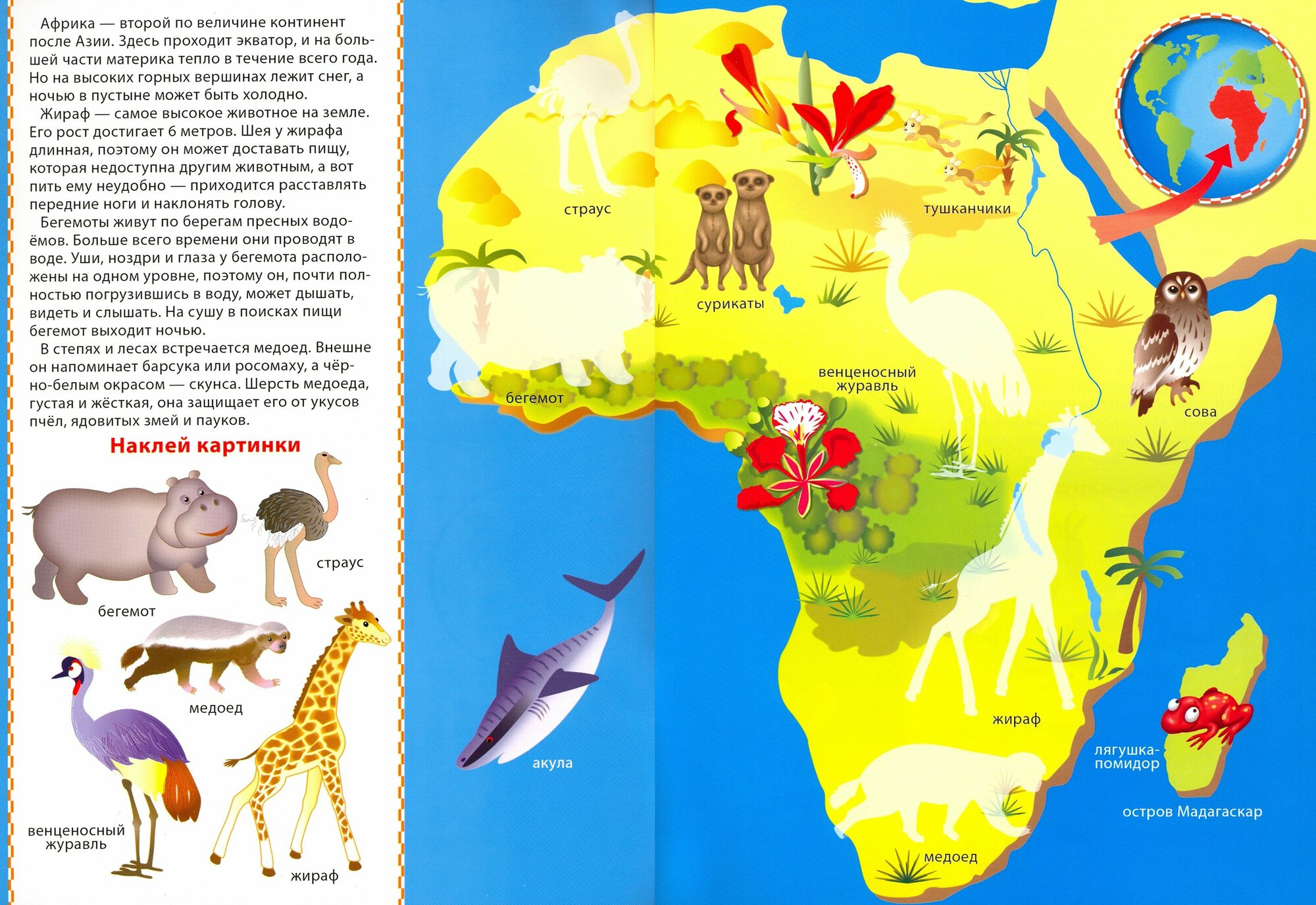 Очень понравилась эта книжка с наклейками в виде Атласа (континент - Африка). Больше всего порадовало в начале описание региона и некоторых животных. Очень люблю, когда есть не только развлекательный, но и познавательный момент!