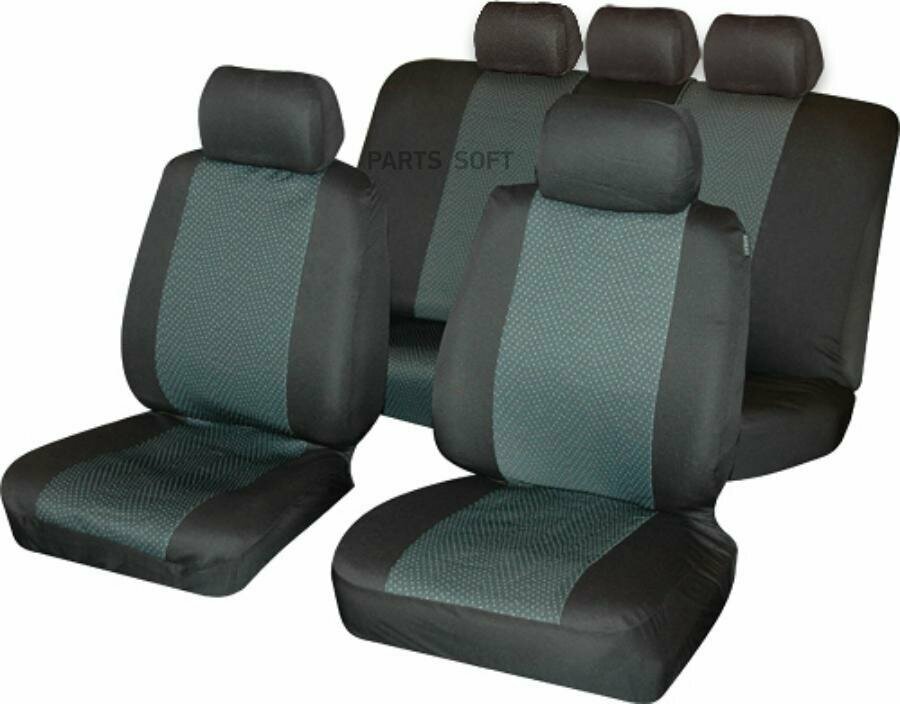 Аксессуары Autostandart Чехлы автомобильные для сидений универсальные AutoStandart Alba, - способ защиты обивки штатных сидений автомобиля от износа, выгорания, грязи и механических повреждений. Выполнены из комбинации материалов: жаккард и полиэстер. Подложка из поролона 2 мм придает дополнительную мягкость. Чехлы AutoStandart имеют специальный шов в местах срабатывания подушек безопасности (AIRBAG). Универсальный размер чехлов AutoStandart подходит на подавляющее большинство автомобильных кресел различной формы. Чехлы переднего ряда оборудованы специальным пластиковым валиком, который устанавливается в стык между спинкой и креслом, обеспечивая плотное прилегание чехлов к автомобильному сиденью, благодаря чему, они не будут сползать с автокресла. Кроме того, в чехлы вшиты четыре резиновые петли со съемными металлическими крючками, которые нужно закрепить под креслом для максимальной фиксации и регулировки натяжение чехлов. Чехлы заднего ряда разделены на секции 1/3 и 2/3 и оснащены двумя молниями, для складывающихся спинок сидений. В комплект входит 5 универсальных подголовников.