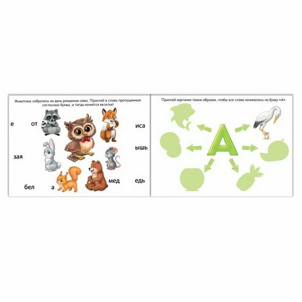Всего 8 стр с заданиями. Потом 50 наклеек просто остались и нет места и заданий, куда их клеить. Написано для детей от 2 лет, но задания сложные даже для 3-х лет. Задания: вклеить пропущенные буквы в алфавите, прочитай слова(прочитай!) и наклей(хорошо ребенок по тени может наклеить), наклеить недостающую букву в слове названий животных, приклей картинки, чтобы все слова заканчивались на букву «Ь» - и эти задания для детей от 2 лет?!