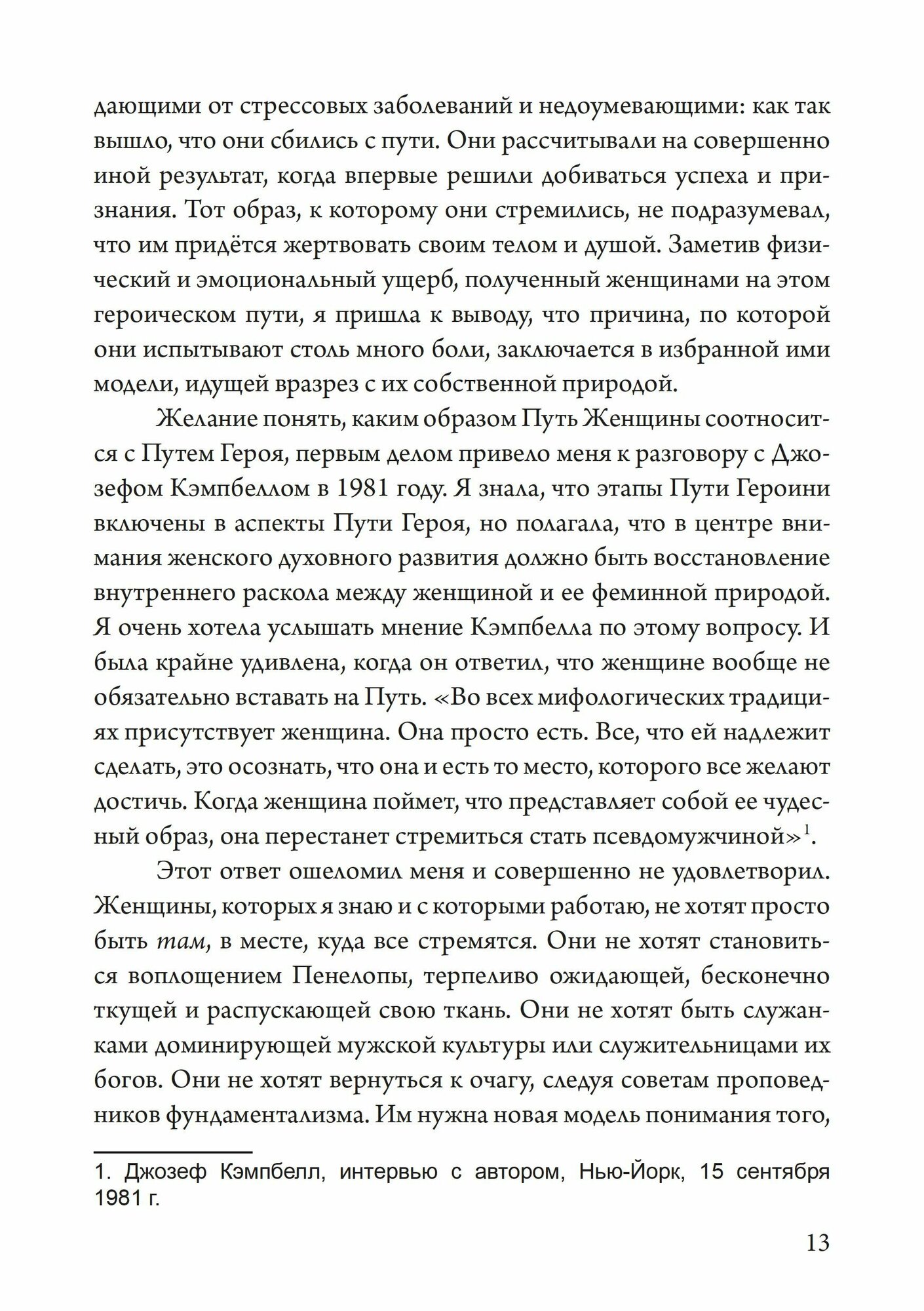 Работая в качестве терапевта с женщинами, особенно в возрасте от тридцати до пятидесяти лет, я слышала оглушительный крик неудовлетворенности их собственными успехами в карьере и бизнесе. Эта неудовлетворенность описывалась, как ощущение стерильности, пустоты, расчленения и даже предательства. Эти женщины переняли стереотипы мужского героического путешествия и достигли успеха в науке, искусстве и финансовой сфере, но все же для многих из них остался открытым вопрос: «Зачем мне все это?».