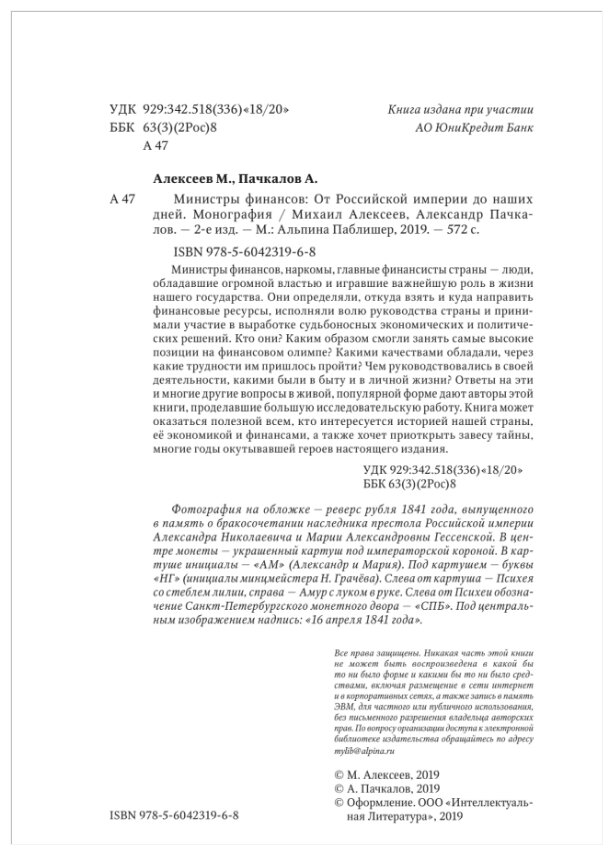 Министры финансов От Российской империи до наших дней (Алексеев Михаил, Пачкалов Александр Владимирович (соавтор)); Альпина Паблишер, 2019