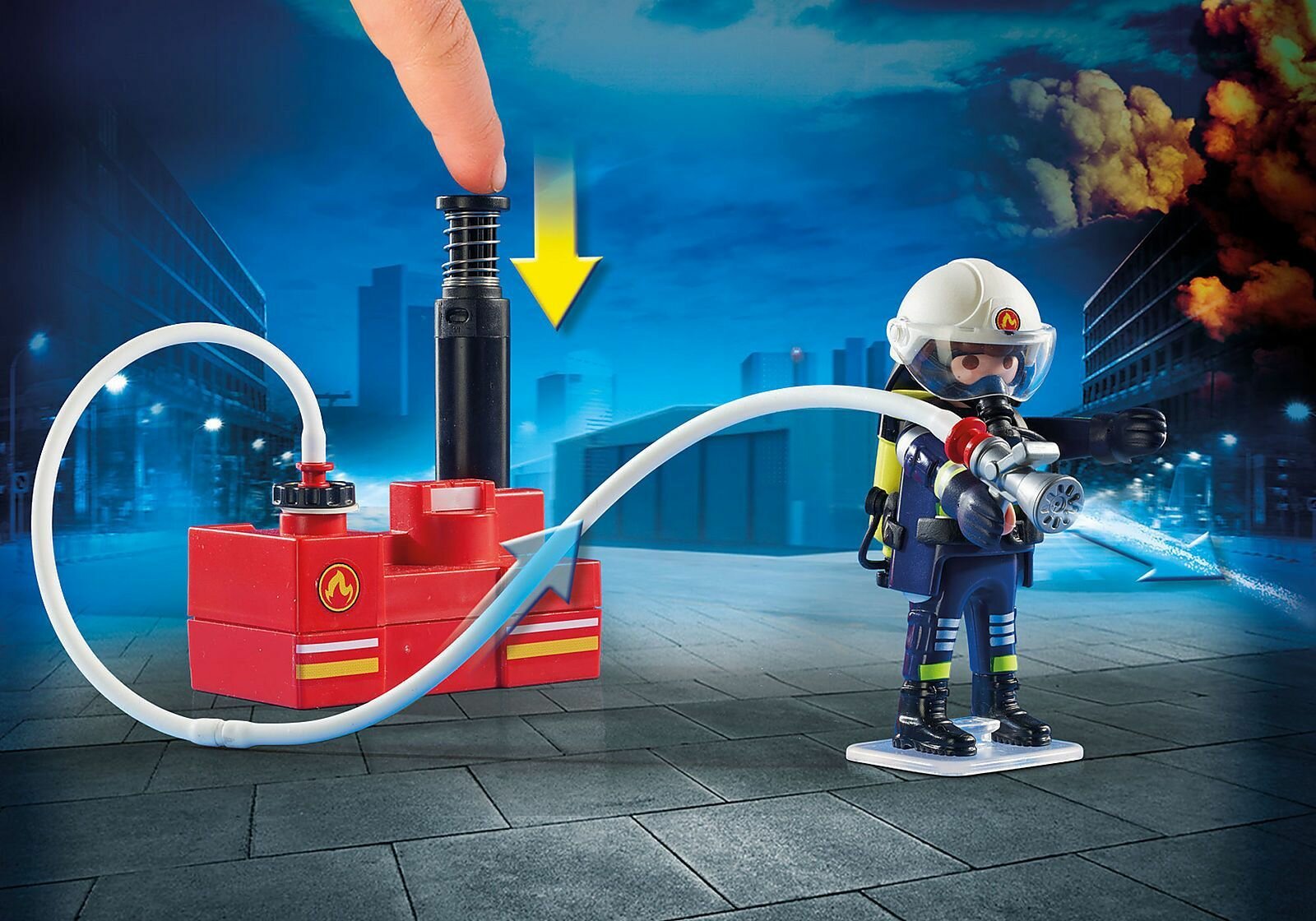 Пожарные имеют специальные костюмы и защитные шлемы. В руках они могут удерживать предметы с помощью пазов. Для того чтобы тушить пожар вблизи огня, есть огнеустойчивая подставка. Пожарный может встать на нее как можно ближе к огню.