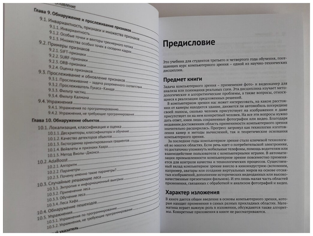 В этой книге вы найдете доступное введение в основные аспекты компьютерного зрения: обработку и анализ изображений, анализ плотного движения, сегментация изображений, работа с камерами, трехмерная реконструкция, сопоставление стереоизображений, обнаружение объектов и др. Материал дополняется историческими справками, рекомендациями по дальнейшему чтению и сведениями о рассматриваемых математических понятиях. В конце каждой главы имеются проверенные на практике упражнения и вопросы на понимание материала.