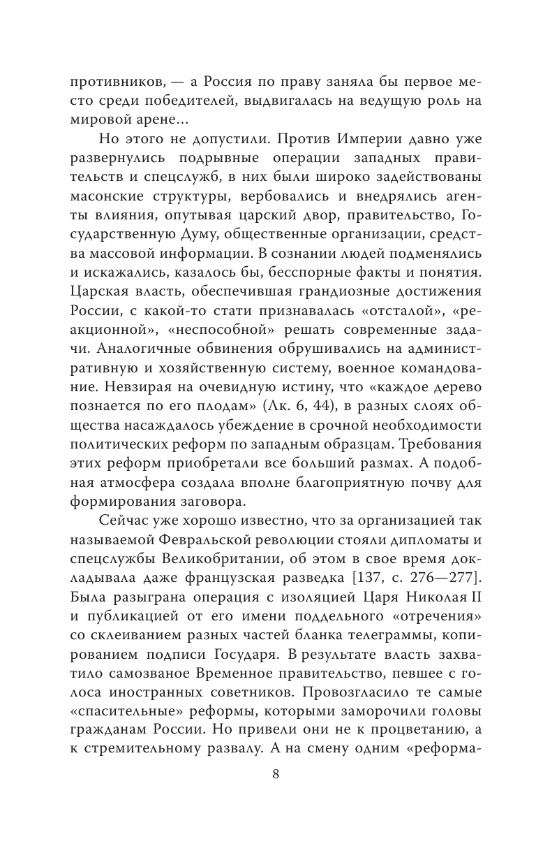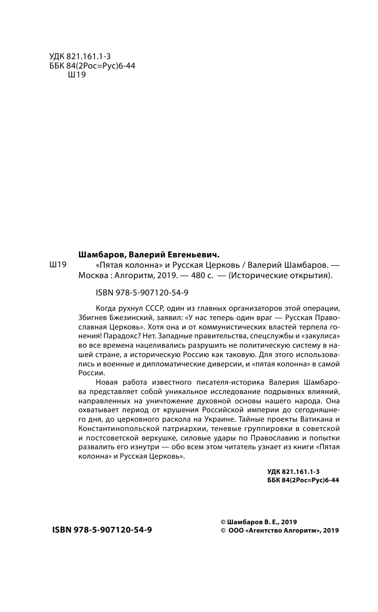 Новая работа известного писателя-историка Валерия Шамбарова представляет собой уникальное исследование подрывных влияний, направленных на уничтожение духовной основы нашего народа. Она охватывает период от крушения Российской Империи до сегодняшнего дня, до церковного раскола на Украине. Тайные проекты Ватикана и Константинопольской Патриархии, теневые группировки в советской и постсоветской верхушке, силовые удары по Православию и попытки развалить его изнутри - обо всем этом читатель узнает из книги "Пятая колонна" и Русская Церковь".
