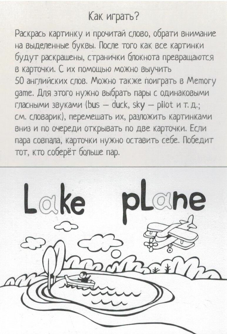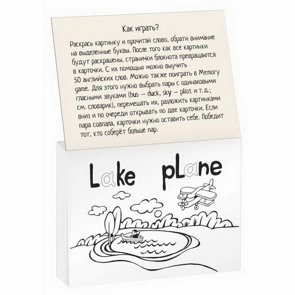 Это блокнот, раскраска и игра одновременно. Страницы легко превращаются в карточки, с которыми интересно играть и удобно учиться. Они помогут ребёнку начать знакомство с английским языком. Потренировать внимание, и моторику рук. Придумывание сюжета и устный рассказ развивают воображение и речевые навыки. Можно также поиграть в Memory game, правила игр есть в блокноте.
